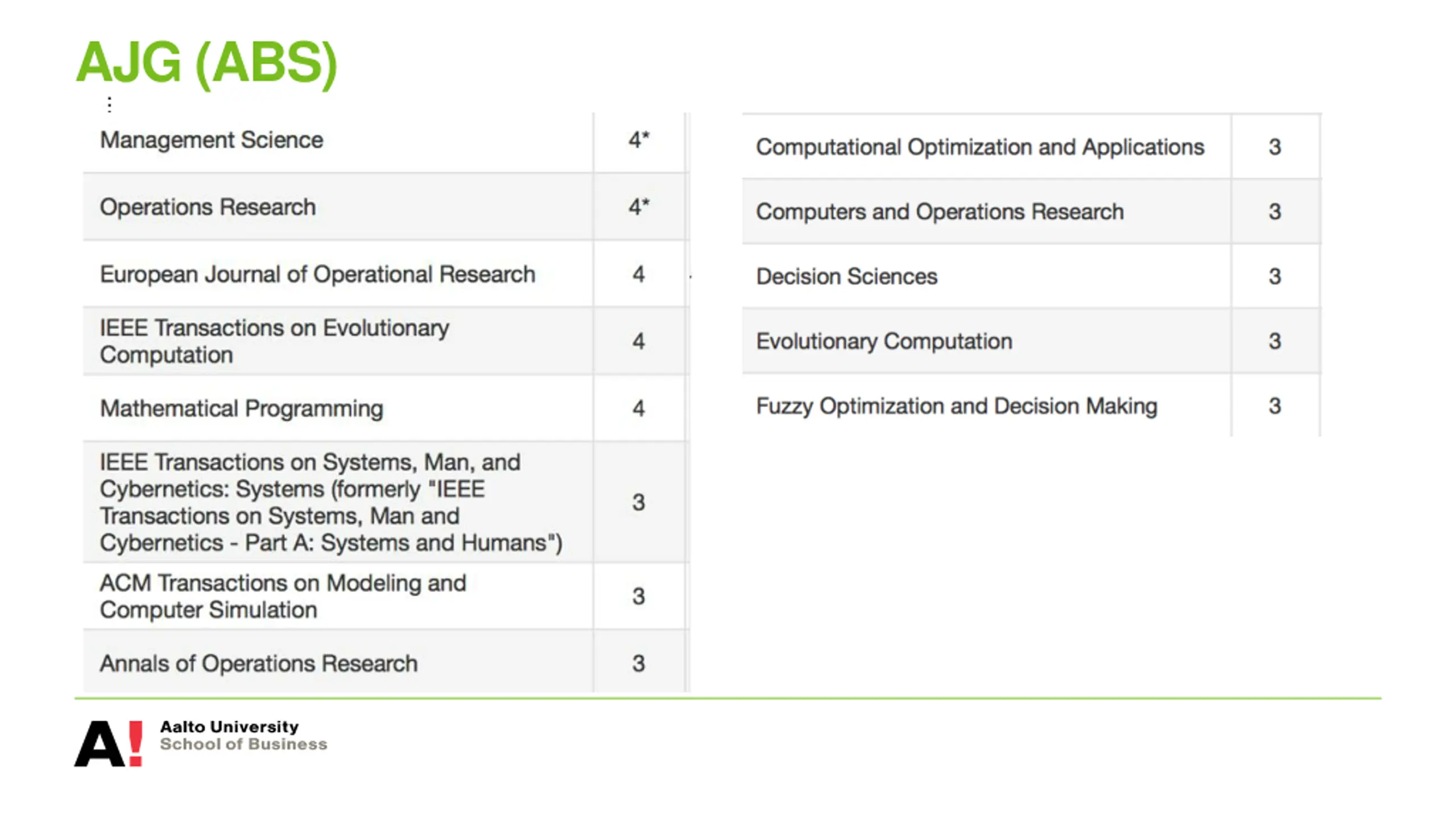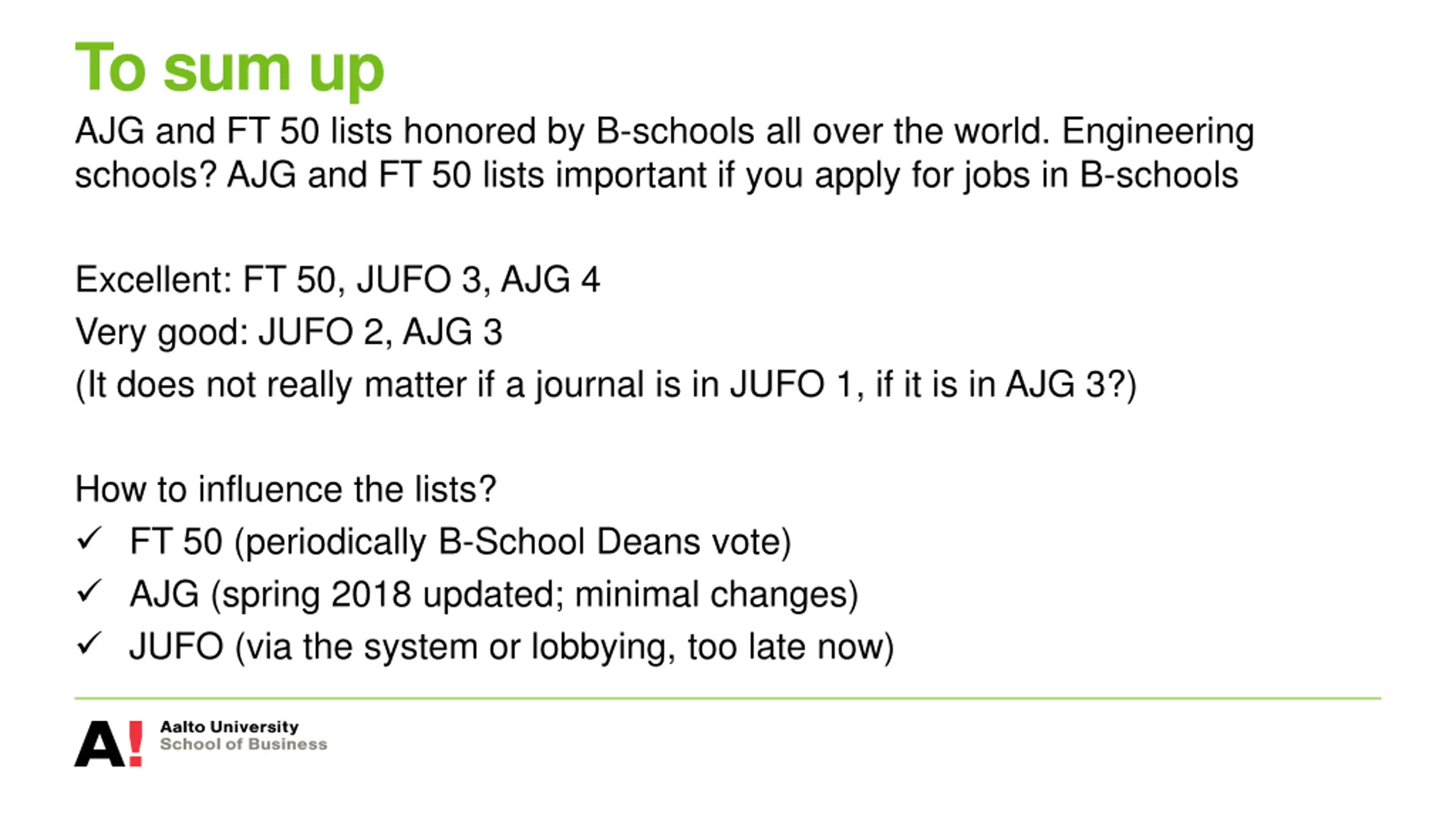 To sum up AJG and FT 50 lists honored by B-schools all over the world. Engineering schools? AJG and FT 50 lists important if you apply for jobs in B-schools Excellent: FT 50, JUFO 3, AJG 4 Very good: JUFO 2, AJG 3 (It does not really matter if a journal is in JUFO 1, if it is in AJG 3?) How to influence the lists? FT 50 (periodically B-School Deans vote) AJG (spring 2018 updated; minimal changes) JUFO (via the system or lobbying, too late now)