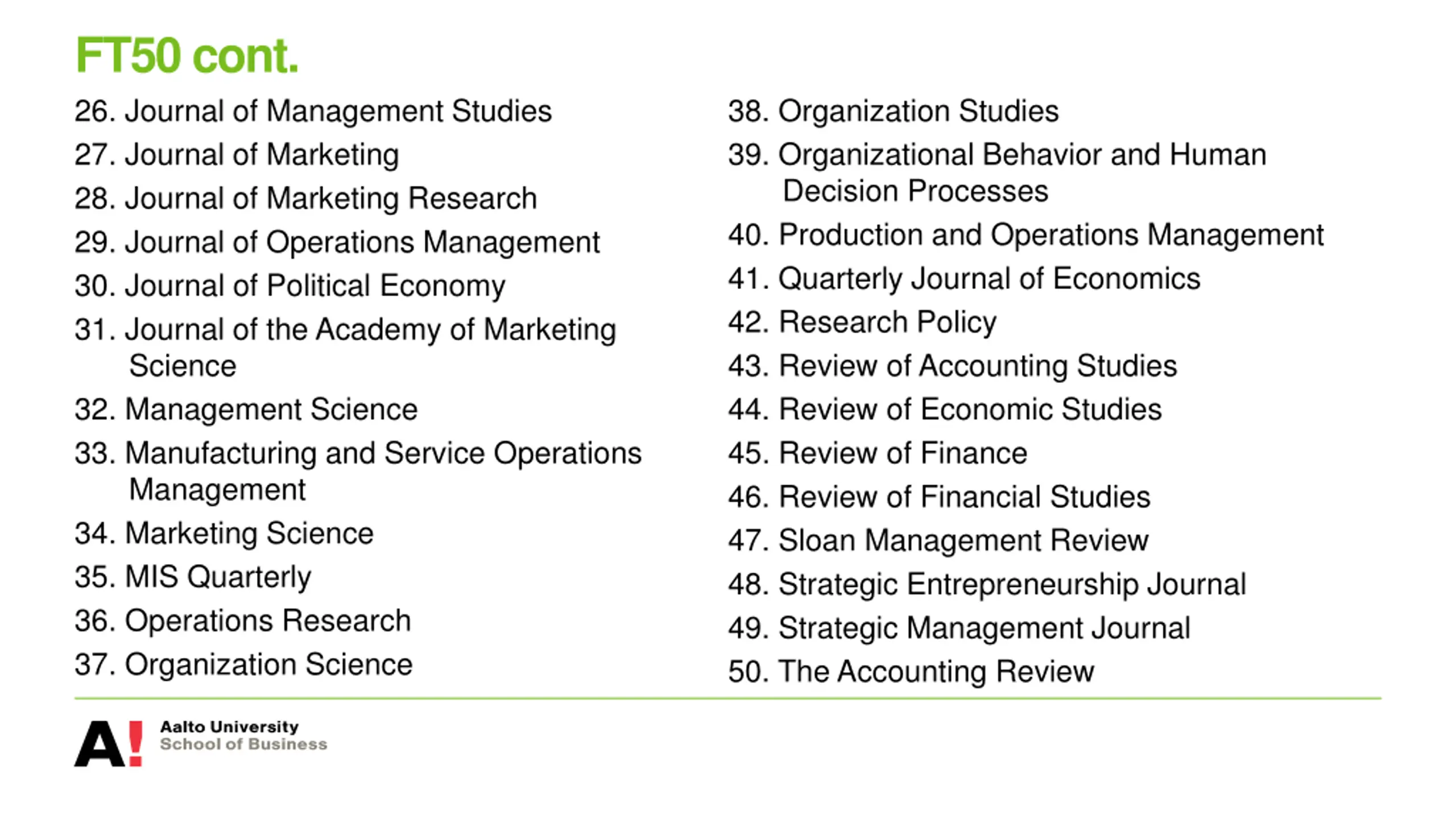 FT50 cont. 26. Journal of Management Studies 27. Journal of Marketing 28. Journal of Marketing Research 29. Journal of Operations Management 30. Journal of Political Economy 31. Journal of the Academy of Marketing Science 32. Management Science 33. Manufacturing and Service Operations Management 34. Marketing Science 35. MIS Quarterly 36. Operations Research 37. Organization Science 38. Organization Studies 39. Organizational Behavior and Human Decision Processes 40. Production and Operations Management 41. Quarterly Journal of Economics 42. Research Policy 43. Review of Accounting Studies 44. Review of Economic Studies 45. Review of Finance 46. Review of Financial Studies 47. Sloan Management Review 48. Strategic Entrepreneurship Journal 49. Strategic Management Journal 50. The Accounting Review