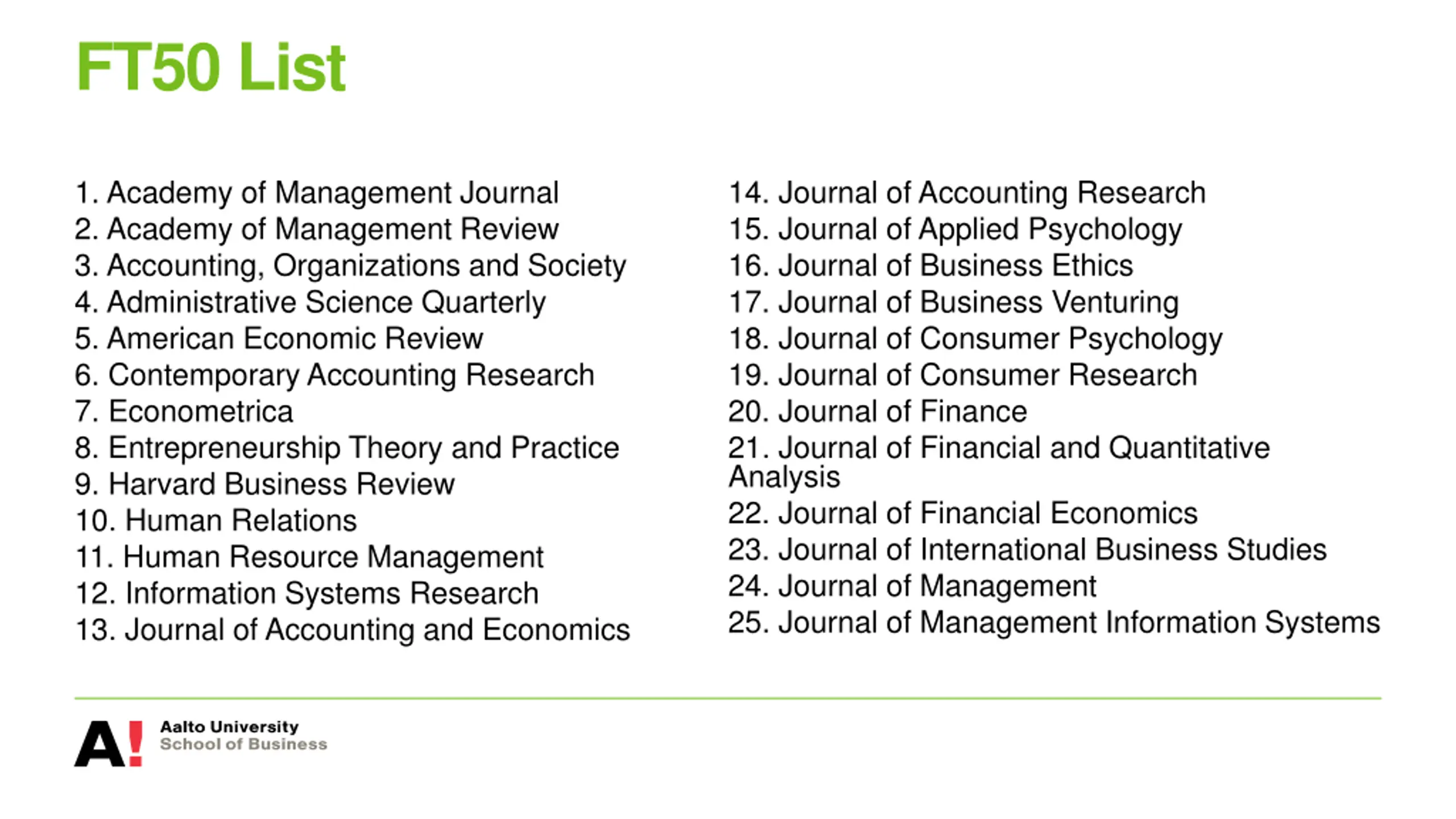 FT50 List 1. Academy of Management Journal 2. Academy of Management Review 3. Accounting, Organizations and Society 4. Administrative Science Quarterly 5. American Economic Review 6. Contemporary Accounting Research 7. Econometrica 8. Entrepreneurship Theory and Practice 9. Harvard Business Review 10. Human Relations 11. Human Resource Management 12. Information Systems Research 13. Journal of Accounting and Economics 14. Journal of Accounting Research 15. Journal of Applied Psychology 16. Journal of Business Ethics 17. Journal of Business Venturing 18. Journal of Consumer Psychology 19. Journal of Consumer Research 20. Journal of Finance 21. Journal of Financial and Quantitative Analysis 22. Journal of Financial Economics 23. Journal of International Business Studies 24. Journal of Management 25. Journal of Management Information Systems
