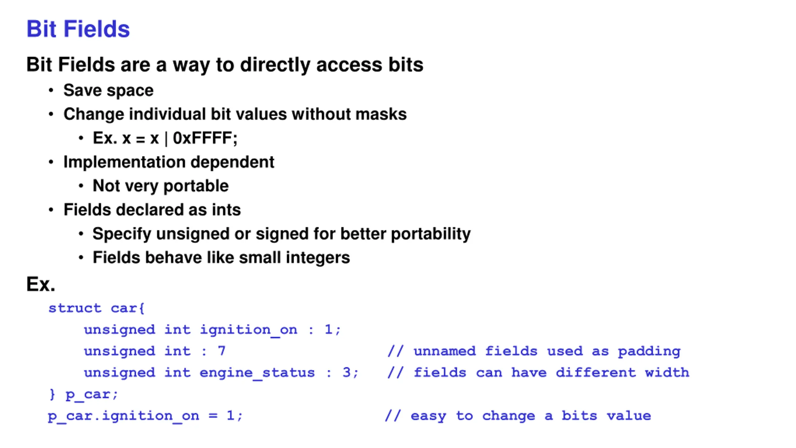 Bit Fields Bit Fields are a way to directly access bits Save space Change individual bit values without masks Ex. x = x | 0xFFFF; Implementation dependent Not very portable Fields declared as ints Specify unsigned or signed for better portability Fields behave like small integers Ex. struct car{ unsigned int ignition_on : 1; unsigned int : 7 unsigned int engine_status : 3; // fields can have different width } p_car; p_car.ignition_on = 1; // unnamed fields used as padding // easy to change a bits value