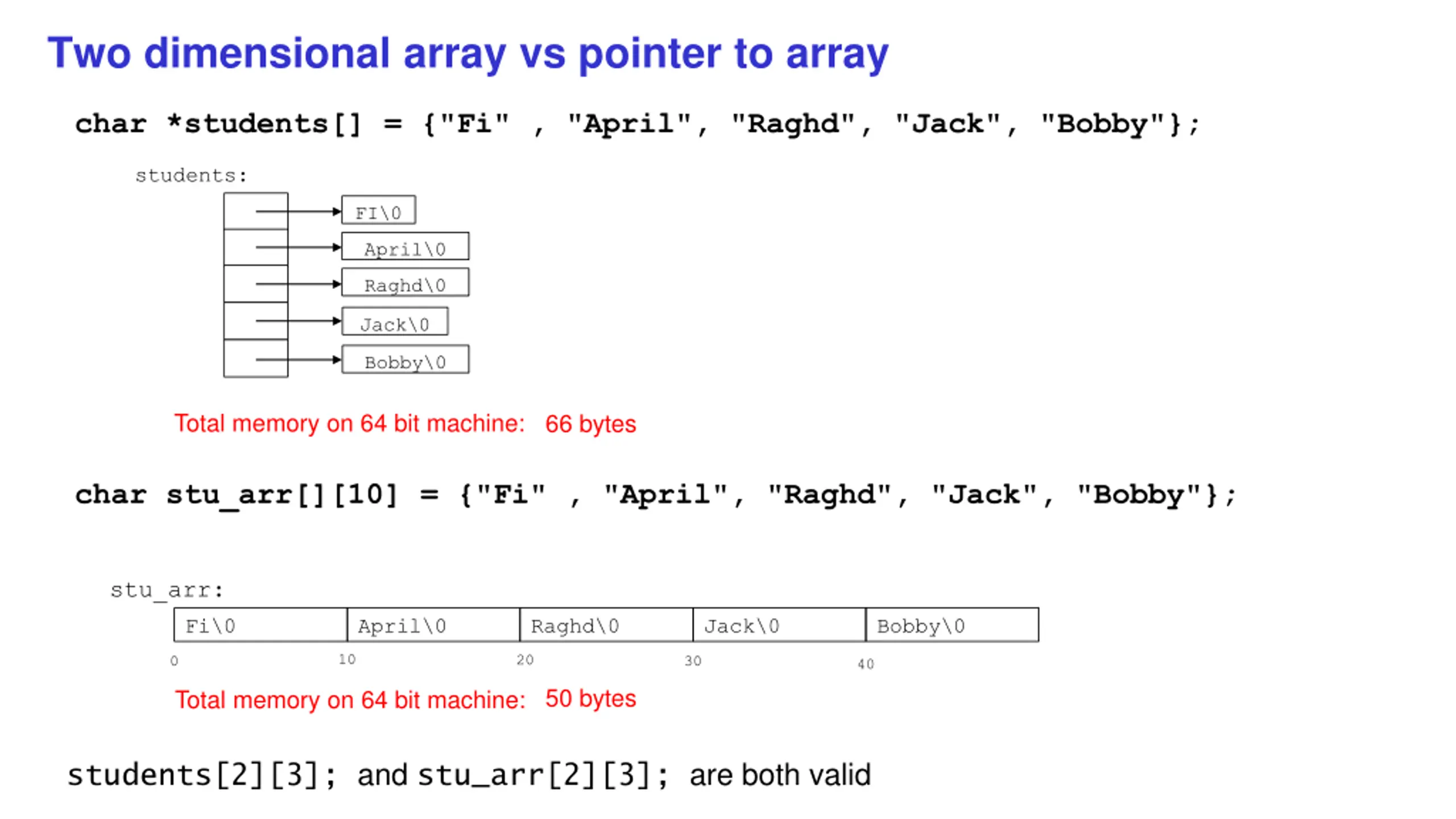 Two dimensional array vs pointer to array char *students[] = {"Fi" , "April", "Raghd", "Jack", "Bobby"}; students: FI\0 April\0 Raghd\0 Jack\0 Bobby\0 Total memory on 64 bit machine: 66 bytes char stu_arr[][10] = {"Fi" , "April", "Raghd", "Jack", "Bobby"}; stu_arr: Fi\0 April\0 Raghd\0 Jack\0 Bobby\0 10 20 0 30 40 50 bytes Total memory on 64 bit machine: students[2][3]; and stu_arr[2][3]; are both valid
