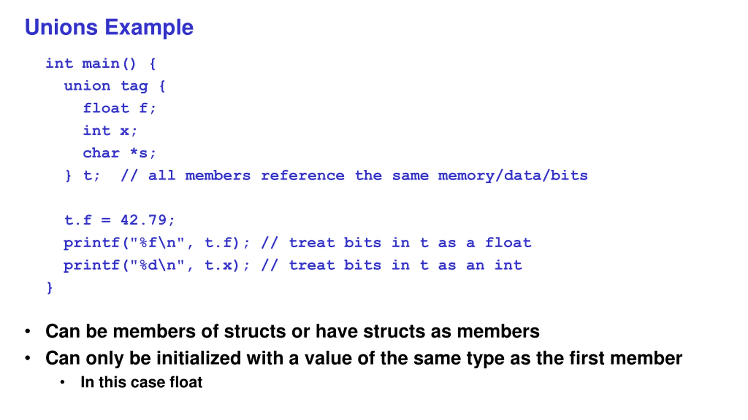 Unions Example int main() { union tag { float f; int x; char *s; } t; // all members reference the same memory/data/bits t.f = 42.79; printf("%f\n", t.f); // treat bits in t as a float printf("%d\n", t.x); // treat bits in t as an int } Can be members of structs or have structs as members Can only be initialized with a value of the same type as the first member In this case float