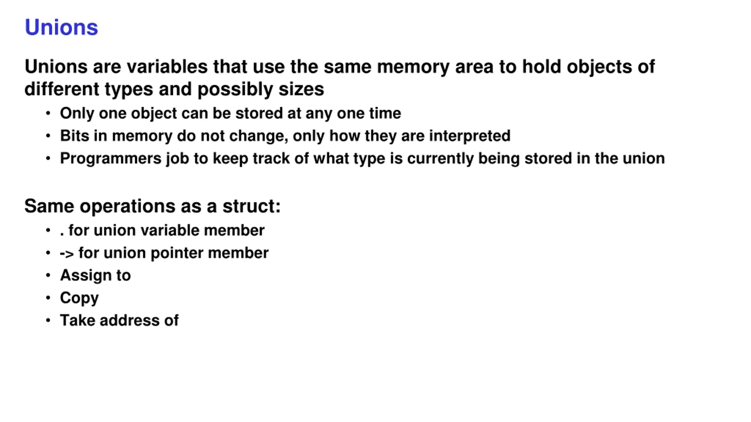 Unions Unions are variables that use the same memory area to hold objects of different types and possibly sizes Only one object can be stored at any one time Bits in memory do not change, only how they are interpreted Programmers job to keep track of what type is currently being stored in the union Same operations as a struct: . for union variable member -> for union pointer member Assign to Copy Take address of