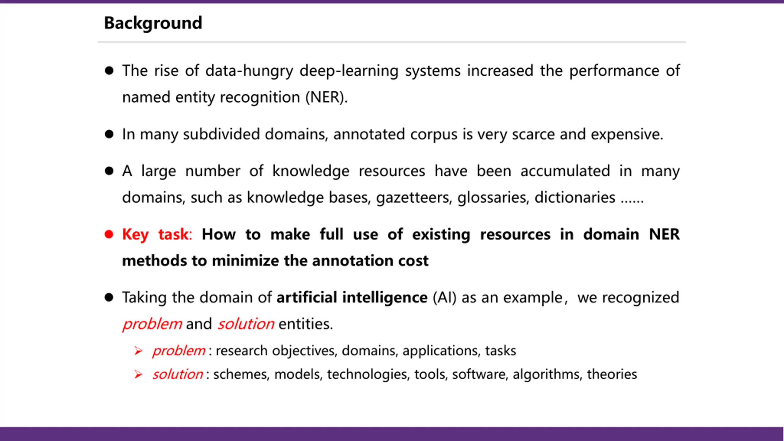 Background The rise of data-hungry deep-learning systems increased the performance of named entity recognition (NER). In many subdivided domains, annotated corpus is very scarce and expensive. A large number of knowledge resources have been accumulated in many domains, such as knowledge bases, gazetteers, glossaries, dictionaries Key task: How to make full use of existing resources in domain NER methods to minimize the annotation cost Taking the domain of artificial intelligence (AI) as an example we recognized problem and solution entities. problem : research objectives, domains, applications, tasks solution : schemes, models, technologies, tools, software, algorithms, theories