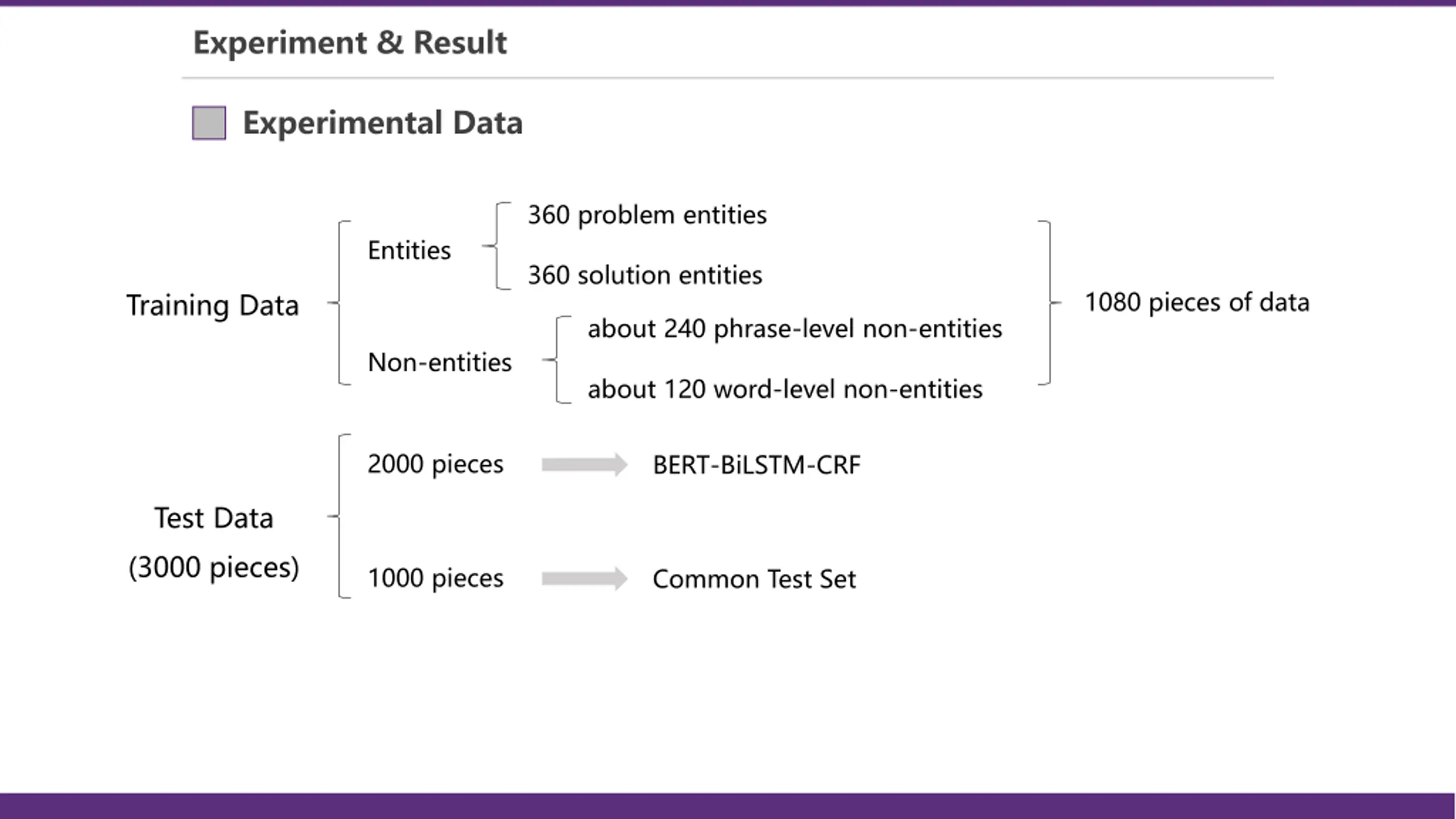 Experiment & Result Experimental Data 360 problem entities Entities 360 solution entities 1080 pieces of data Training Data about 240 phrase-level non-entities Non-entities about 120 word-level non-entities 2000 pieces BERT-BiLSTM-CRF Test Data (3000 pieces) 1000 pieces Common Test Set