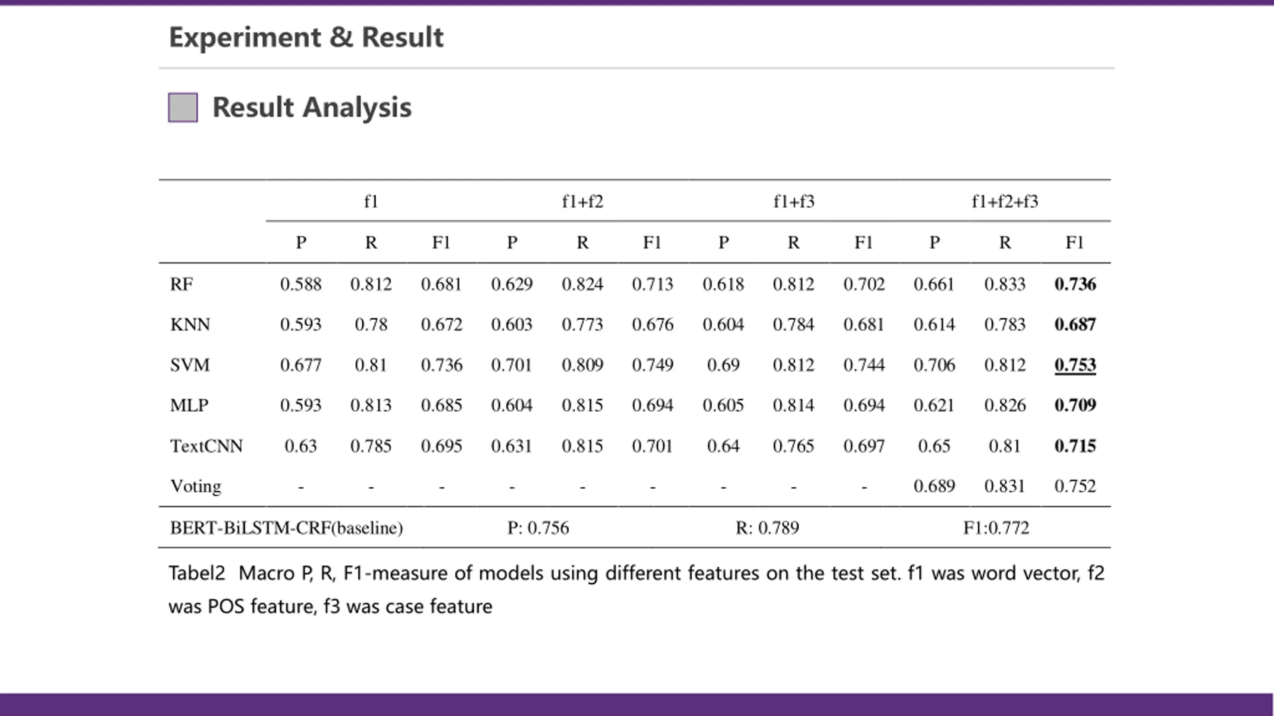 Experiment & Result Result Analysis f1 f1+f2 f1+f3 f1+f2+f3 P R F1 P R F1 P R F1 P R F1 0.736 RF 0.588 0.812 0.681 0.629 0.824 0.713 0.618 0.812 0.702 0.661 0.833 0.687 KNN 0.593 0.78 0.672 0.603 0.773 0.676 0.604 0.784 0.681 0.614 0.783 0.753 SVM 0.677 0.81 0.736 0.701 0.809 0.749 0.69 0.812 0.744 0.706 0.812 0.709 MLP 0.593 0.813 0.685 0.604 0.815 0.694 0.605 0.814 0.694 0.621 0.826 0.715 TextCNN 0.63 0.785 0.695 0.631 0.815 0.701 0.64 0.765 0.697 0.65 0.81 Voting - - - - - - - - - 0.689 0.831 0.752 BERT-BiLSTM-CRF(baseline) P: 0.756 R: 0.789 F1:0.772 Tabel2 Macro P, R, F1-measure of models using different features on the test set. f1 was word vector, f2 was POS feature, f3 was case feature