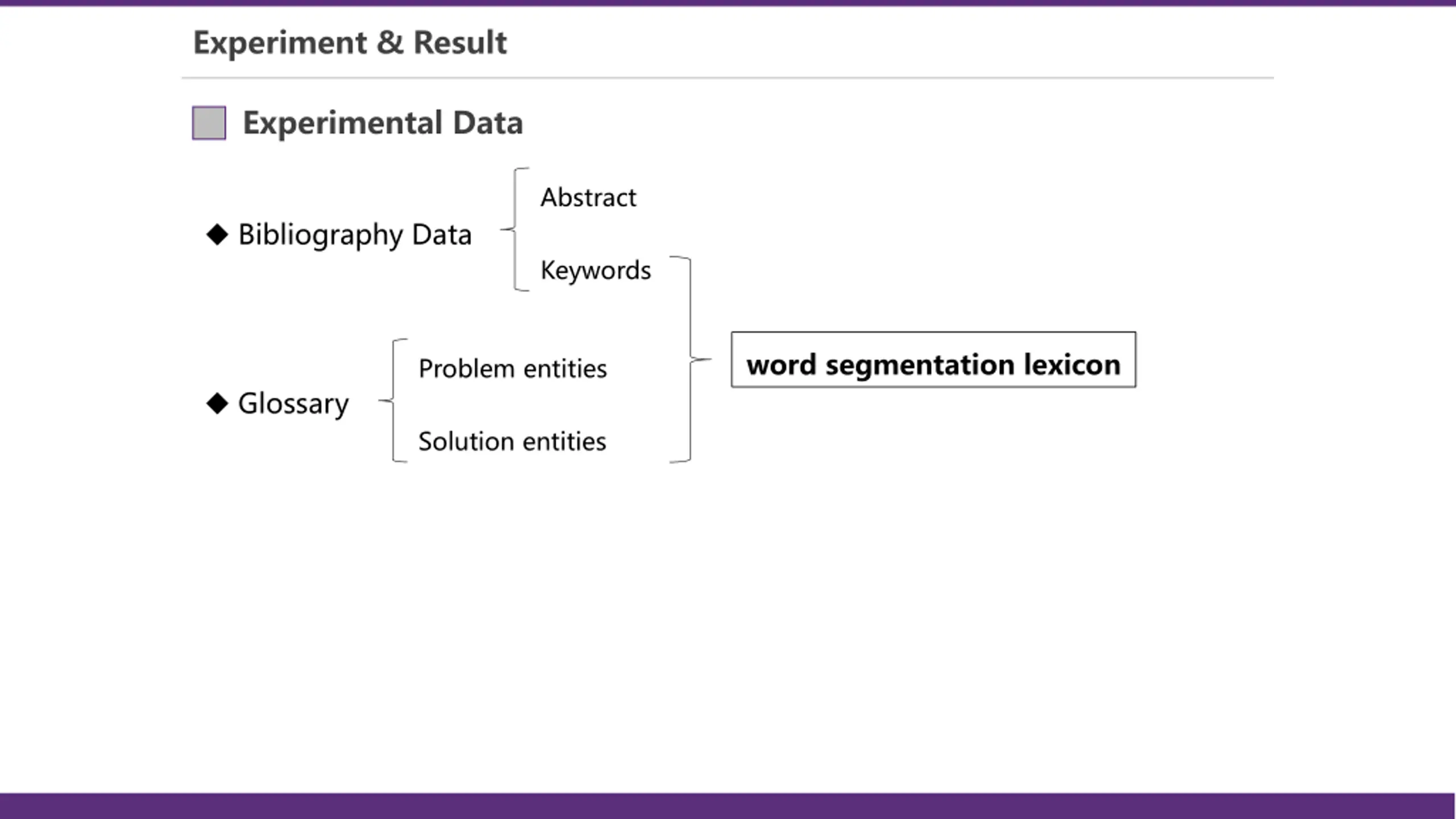 Experiment & Result Experimental Data Abstract Bibliography Data Keywords word segmentation lexicon Problem entities Glossary Solution entities