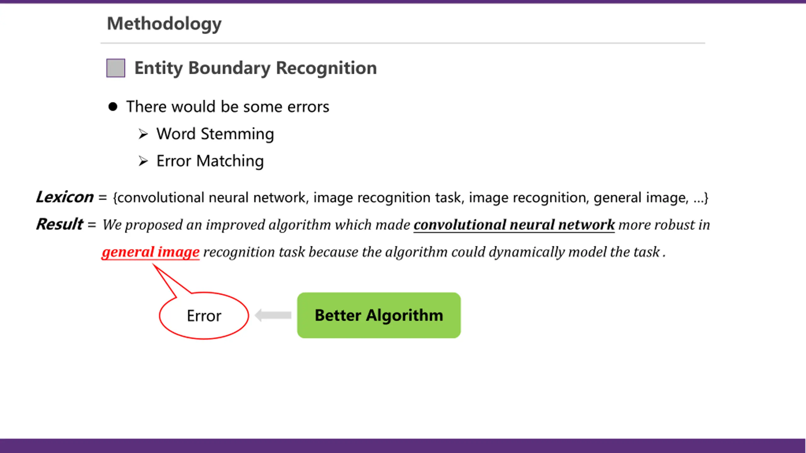 Methodology Entity Boundary Recognition There would be some errors Word Stemming Error Matching Lexicon = {convolutional neural network, image recognition task, image recognition, general image, } Result = We proposed an improved algorithm which made convolutional neural network more robust in general image recognition task because the algorithm could dynamically model the task . Better Algorithm Error