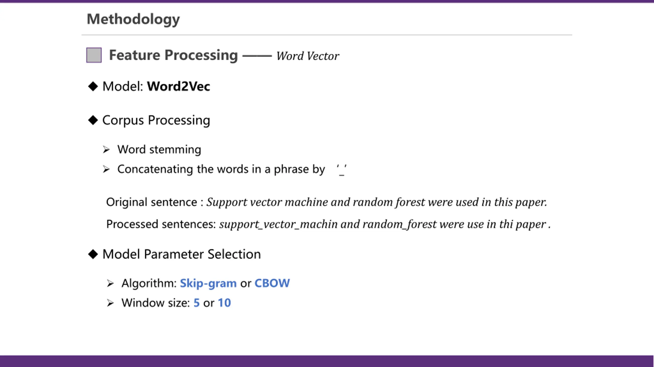 Methodology Feature Processing Word Vector Model: Word2Vec Corpus Processing Word stemming Concatenating the words in a phrase by _ Original sentence : Support vector machine and random forest were used in this paper. Processed sentences: support_vector_machin and random_forest were use in thi paper . Model Parameter Selection Algorithm: Skip-gram or CBOW Window size: 5 or 10