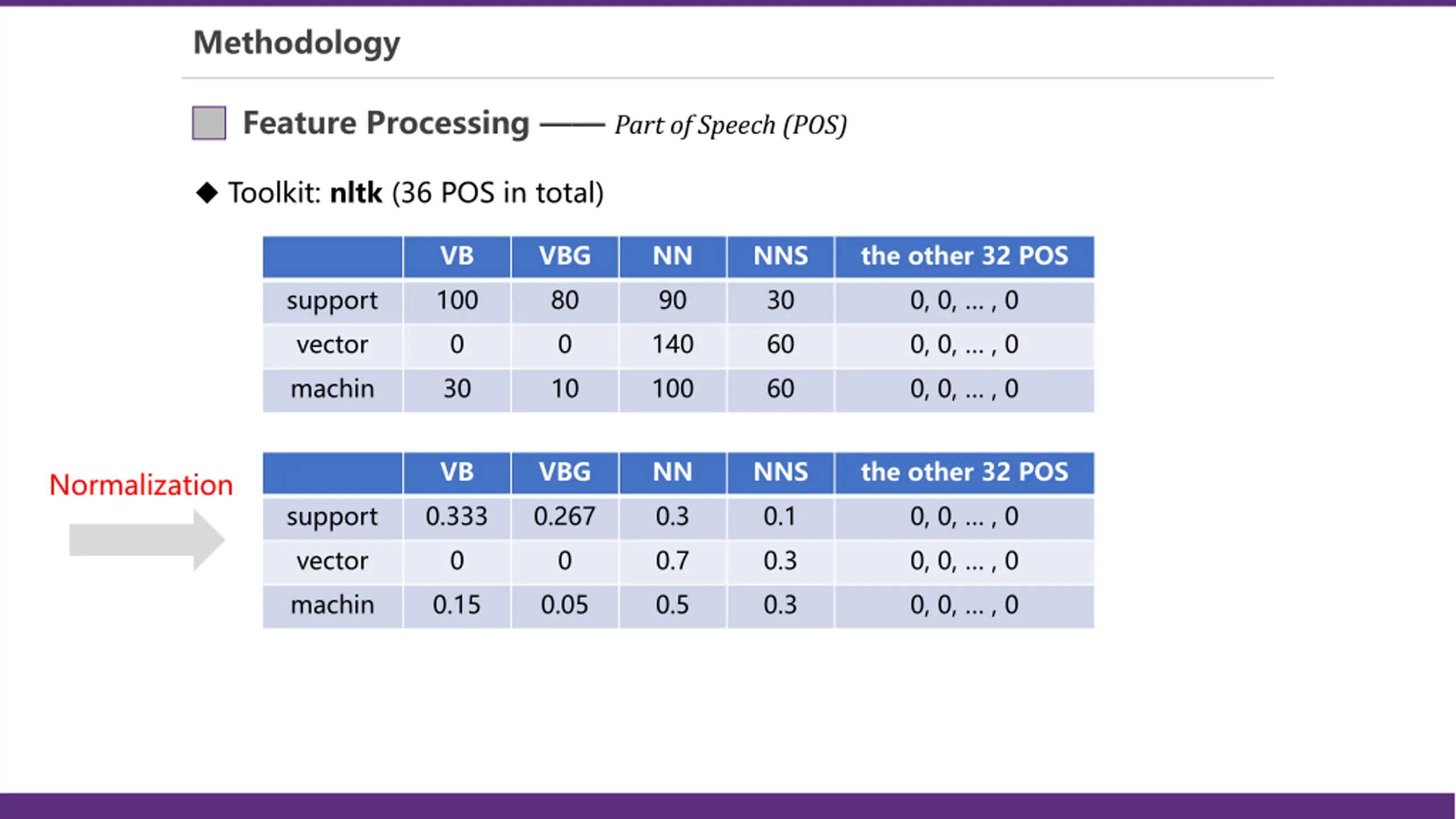 Methodology Feature Processing Part of Speech (POS) Toolkit: nltk (36 POS in total) VB VBG NN NNS the other 32 POS support 100 80 90 30 0, 0, , 0 vector 0 0 140 60 0, 0, , 0 machin 30 10 100 60 0, 0, , 0 VB VBG NN NNS the other 32 POS Normalization support 0.333 0.267 0.3 0.1 0, 0, , 0 vector 0 0 0.7 0.3 0, 0, , 0 machin 0.15 0.05 0.5 0.3 0, 0, , 0