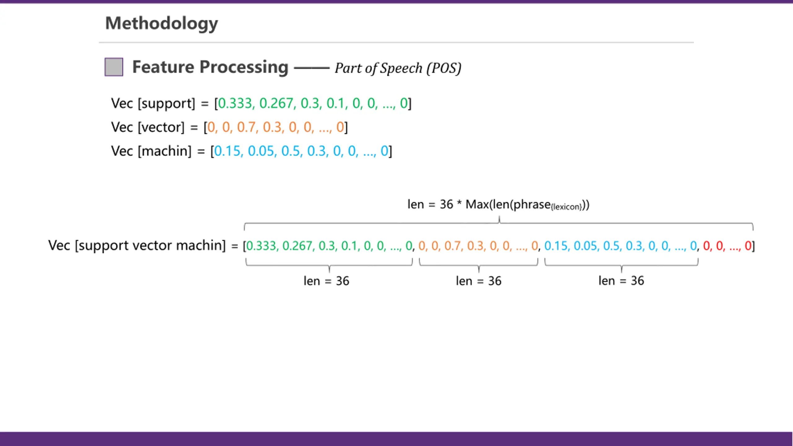 Methodology Feature Processing Part of Speech (POS) Vec [support] = [0.333, 0.267, 0.3, 0.1, 0, 0, , 0] Vec [vector] = [0, 0, 0.7, 0.3, 0, 0, , 0] Vec [machin] = [0.15, 0.05, 0.5, 0.3, 0, 0, , 0] len = 36 * Max(len(phrase{lexicon})) Vec [support vector machin] = [0.333, 0.267, 0.3, 0.1, 0, 0, , 0, 0, 0, 0.7, 0.3, 0, 0, , 0, 0.15, 0.05, 0.5, 0.3, 0, 0, , 0, 0, 0, , 0] len = 36 len = 36 len = 36