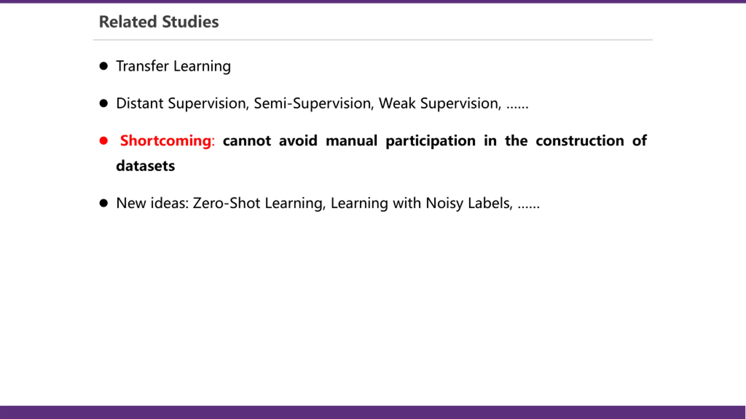Related Studies Transfer Learning Distant Supervision, Semi-Supervision, Weak Supervision, Shortcoming: cannot avoid manual participation in the construction of datasets New ideas: Zero-Shot Learning, Learning with Noisy Labels,
