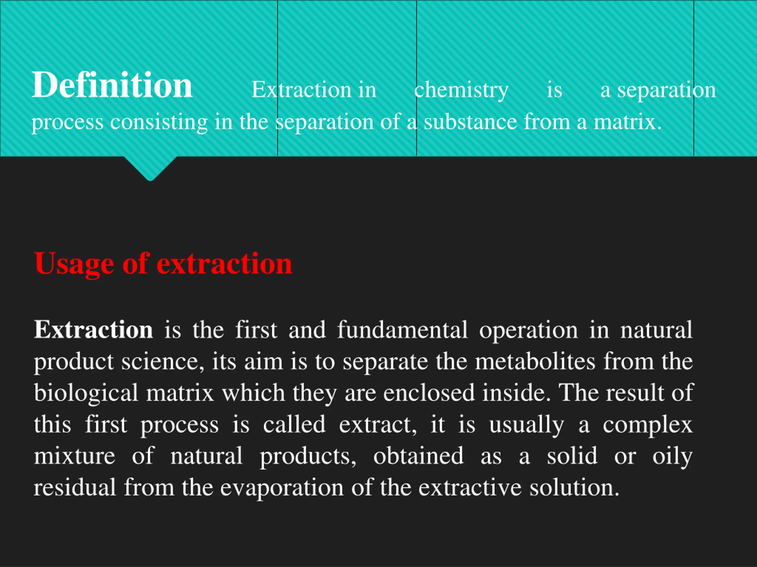 Definition process consisting in the separation of a substance from a matrix. Extraction in chemistry is a separation Usage of extraction Extraction is the first and fundamental operation in natural product science, its aim is to separate the metabolites from the biological matrix which they are enclosed inside. The result of this first process is called extract, it is usually a complex mixture of natural products, obtained as a solid or oily residual from the evaporation of the extractive solution.