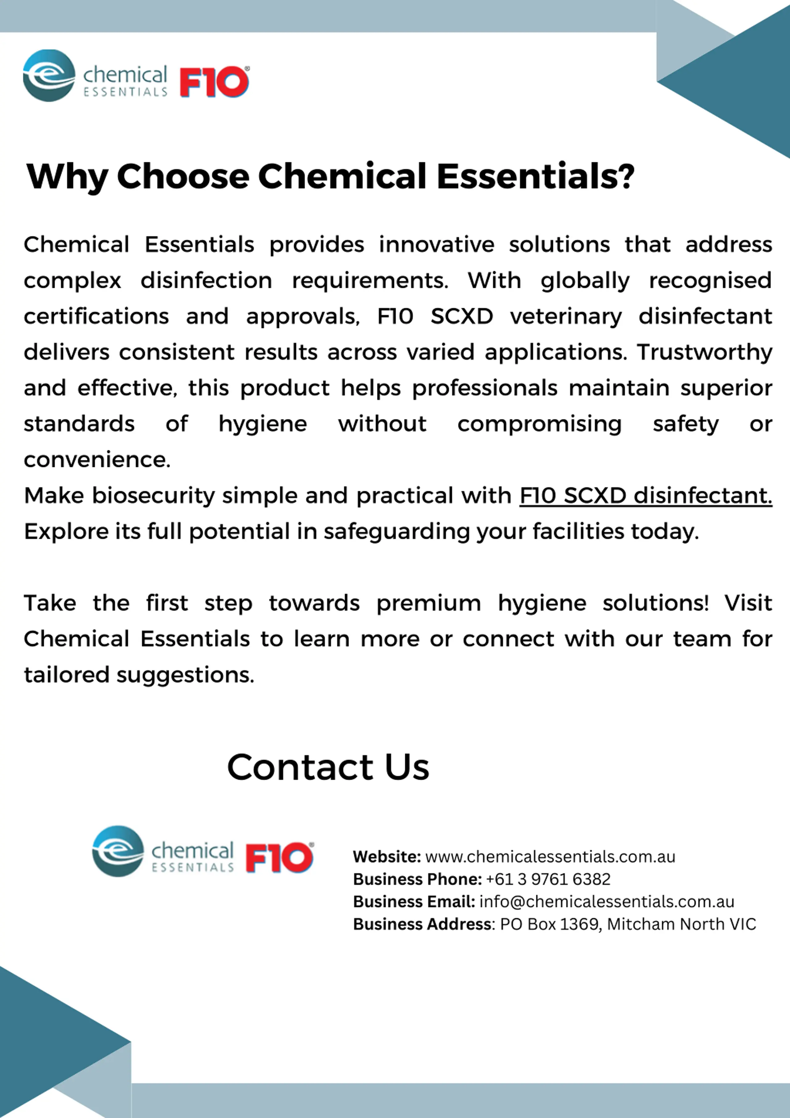 Why Choose Chemical Essentials? Chemical Essentials provides innovative solutions that address complex disinfection requirements. With globally recognised certifications and approvals, F10 SCXD veterinary disinfectant delivers consistent results across varied applications. Trustworthy and effective, this product helps professionals maintain superior standards of hygiene without convenience. Make biosecurity simple and practical with F10 SCXD disinfectant. Explore its full potential in safeguarding your facilities today. compromising safety or Take the first step towards premium hygiene solutions! Visit Chemical Essentials to learn more or connect with our team for tailored suggestions. Contact Us Website: www.chemicalessentials.com.au Business Phone: +61 3 9761 6382 Business Email: info@chemicalessentials.com.au Business Address: PO Box 1369, Mitcham North VIC
