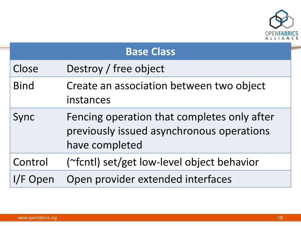 Base Class Close Bind Destroy / free object Create an association between two object instances Fencing operation that completes only after previously issued asynchronous operations have completed (~fcntl) set/get low-level object behavior Open provider extended interfaces Sync Control I/F Open 18 www.openfabrics.org