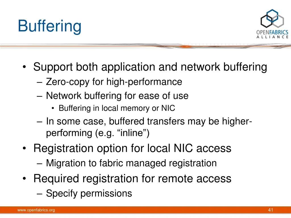 Buffering Support both application and network buffering Zero-copy for high-performance Network buffering for ease of use Buffering in local memory or NIC In some case, buffered transfers may be higher- performing (e.g. inline ) Registration option for local NIC access Migration to fabric managed registration Required registration for remote access Specify permissions 41 www.openfabrics.org