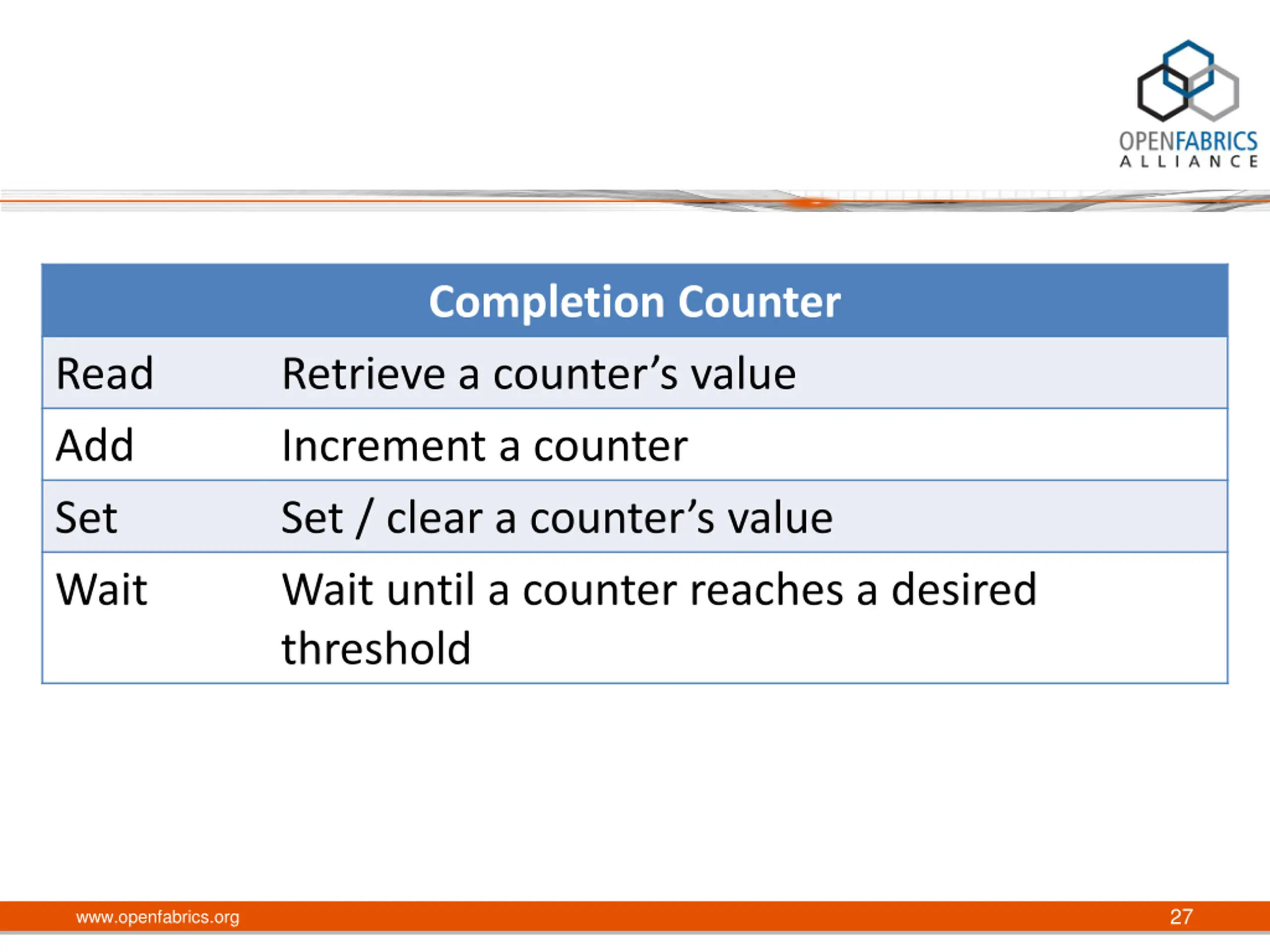 Completion Counter Retrieve a counter s value Increment a counter Set / clear a counter s value Wait until a counter reaches a desired threshold Read Add Set Wait 27 www.openfabrics.org