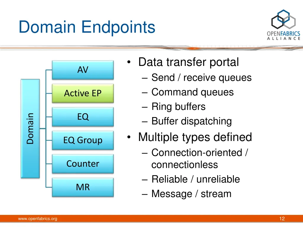 Domain Endpoints Data transfer portal Send / receive queues Command queues Ring buffers Buffer dispatching Multiple types defined Connection-oriented / connectionless Reliable / unreliable Message / stream AV Active EP EQ Domain EQ Group Counter MR 12 www.openfabrics.org