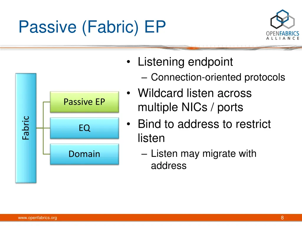 Fabric Represents a communication domain or boundary Single IB or RoCE subnet, IP (iWarp) network, Ethernet subnet Multiple local NICs / ports Topology data, network time stamps Determines native addressing Mapped addressing possible GID/LID versus IP Passive EP Fabric EQ Domain 7 www.openfabrics.org
