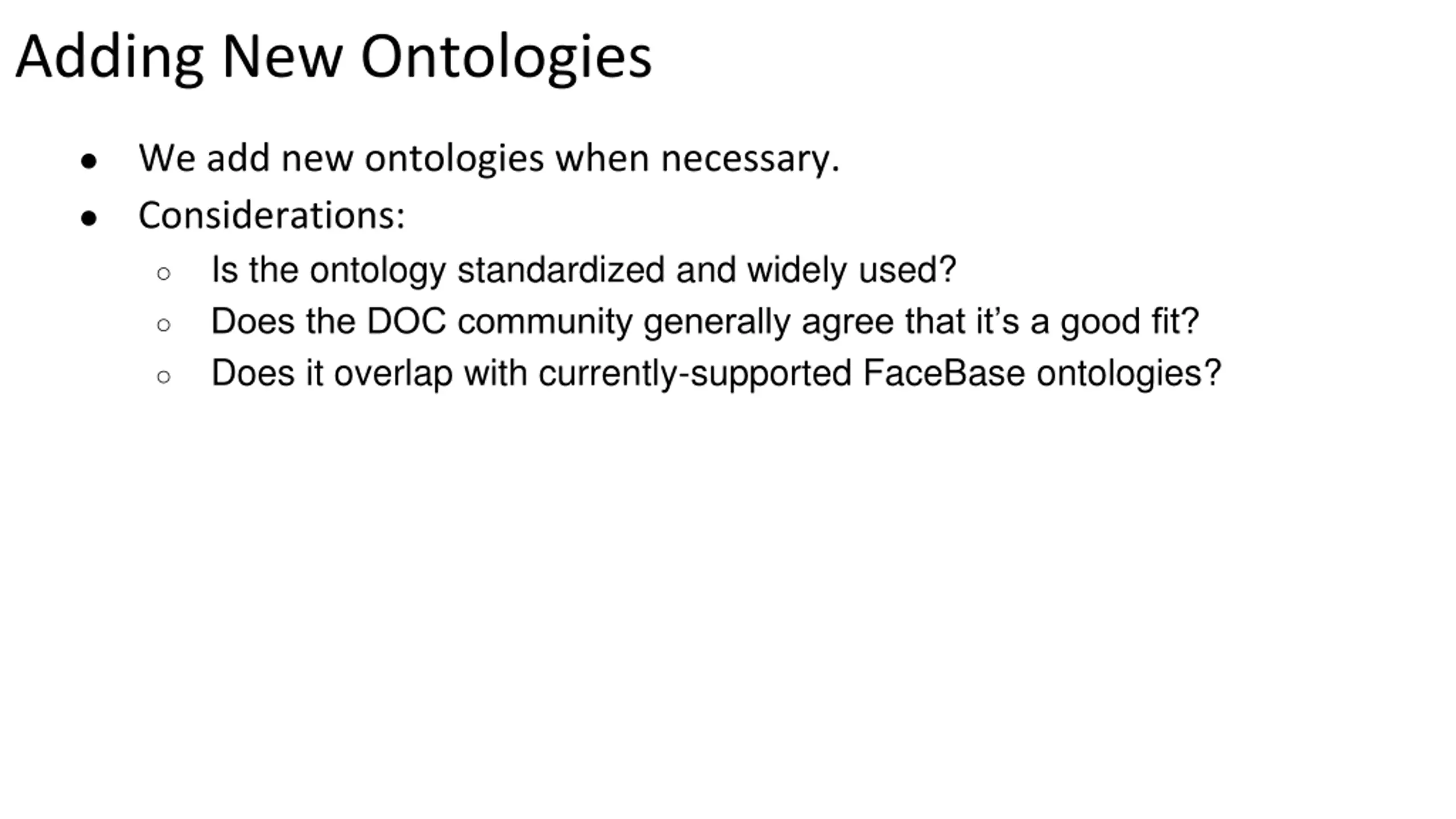 Adding New Ontologies We add new ontologies when necessary. Considerations: Is the ontology standardized and widely used? Does the DOC community generally agree that it s a good fit? Does it overlap with currently-supported FaceBase ontologies?