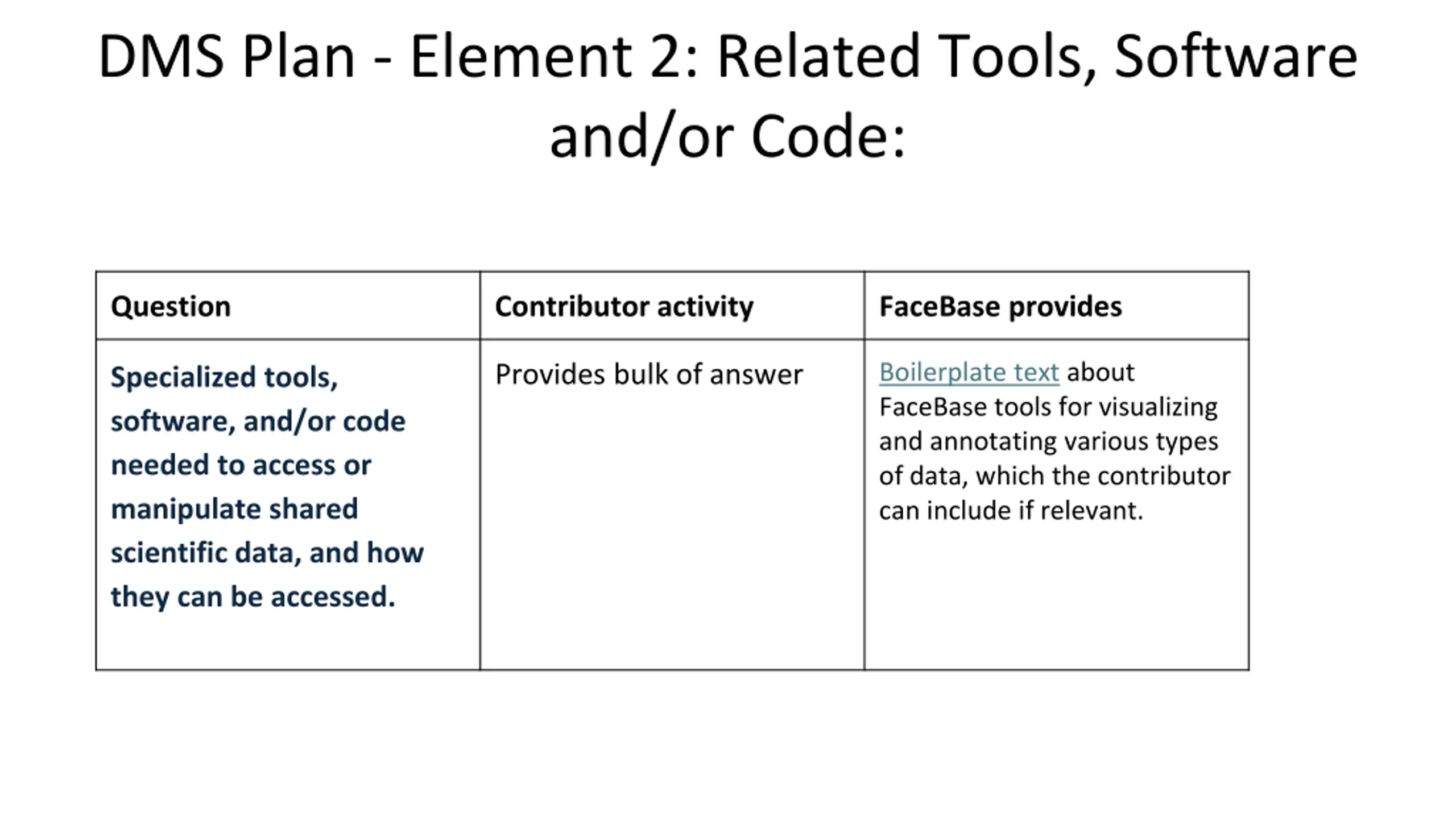 DMS Plan - Element 2: Related Tools, Software and/or Code: Question Contributor activity FaceBase provides Boilerplate text about FaceBase tools for visualizing and annotating various types of data, which the contributor can include if relevant. Provides bulk of answer Specialized tools, software, and/or code needed to access or manipulate shared scientific data, and how they can be accessed.