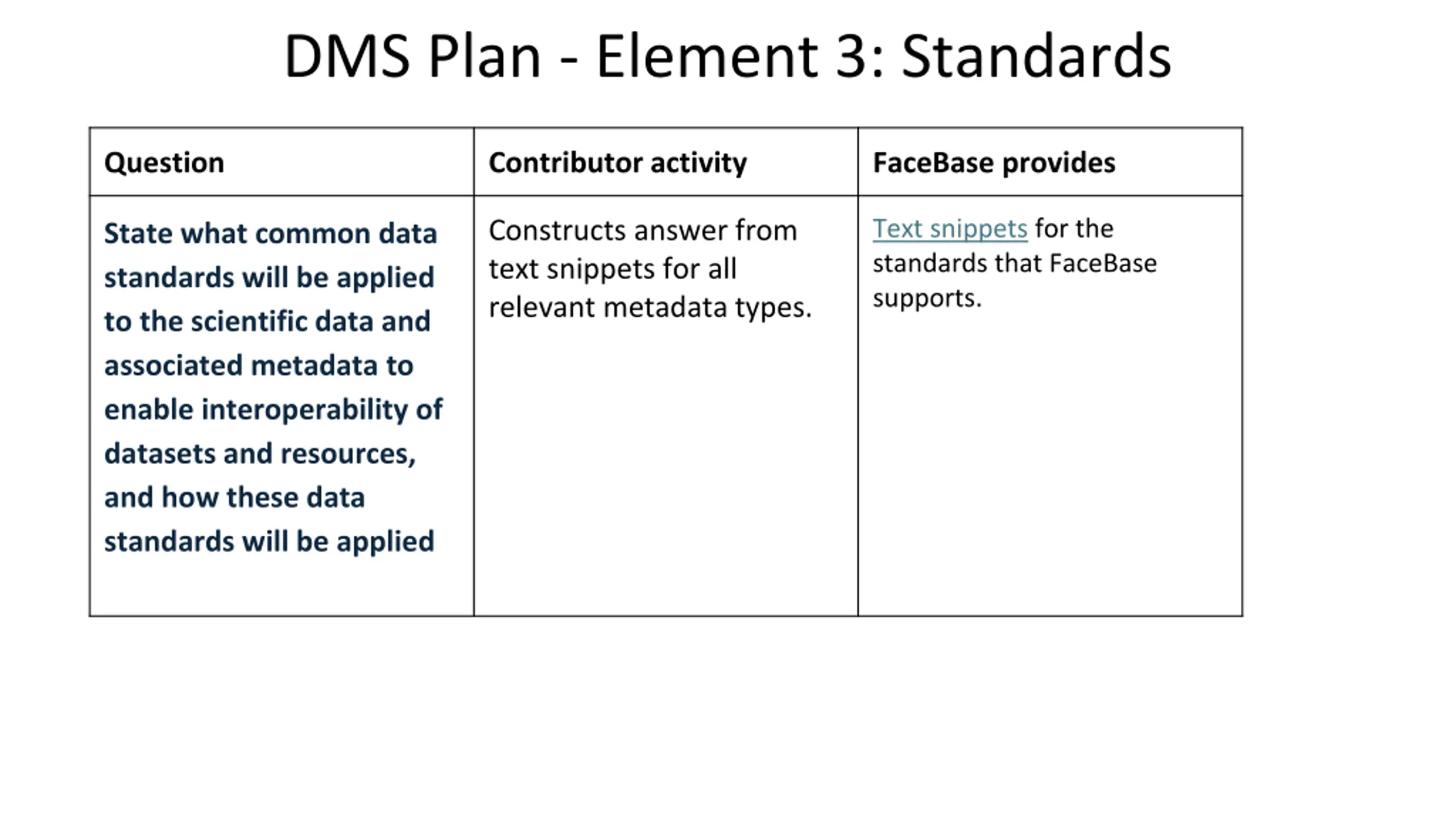 DMS Plan - Element 3: Standards Question Contributor activity FaceBase provides Text snippets for the standards that FaceBase supports. Constructs answer from text snippets for all relevant metadata types. State what common data standards will be applied to the scientific data and associated metadata to enable interoperability of datasets and resources, and how these data standards will be applied