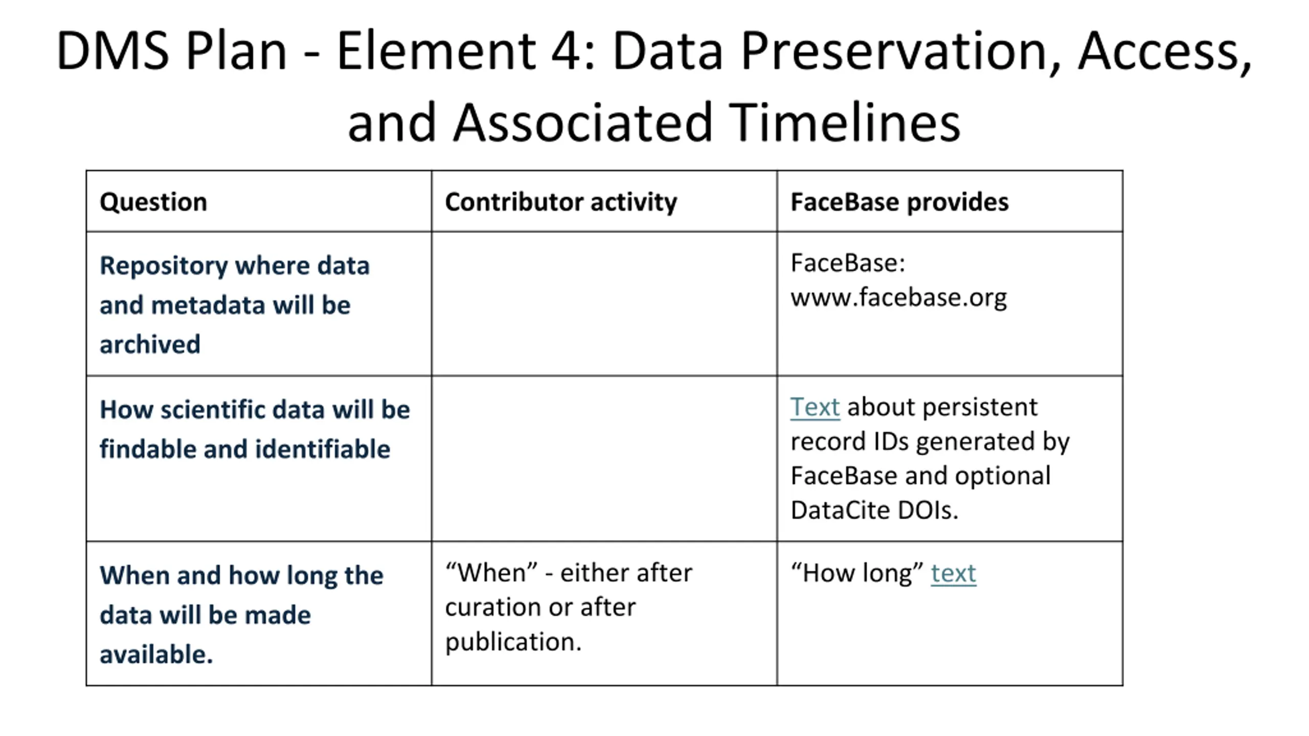 DMS Plan - Element 4: Data Preservation, Access, and Associated Timelines Question Contributor activity FaceBase provides FaceBase: www.facebase.org Repository where data and metadata will be archived Text about persistent record IDs generated by FaceBase and optional DataCite DOIs. How scientific data will be findable and identifiable When - either after curation or after publication. How long text When and how long the data will be made available.
