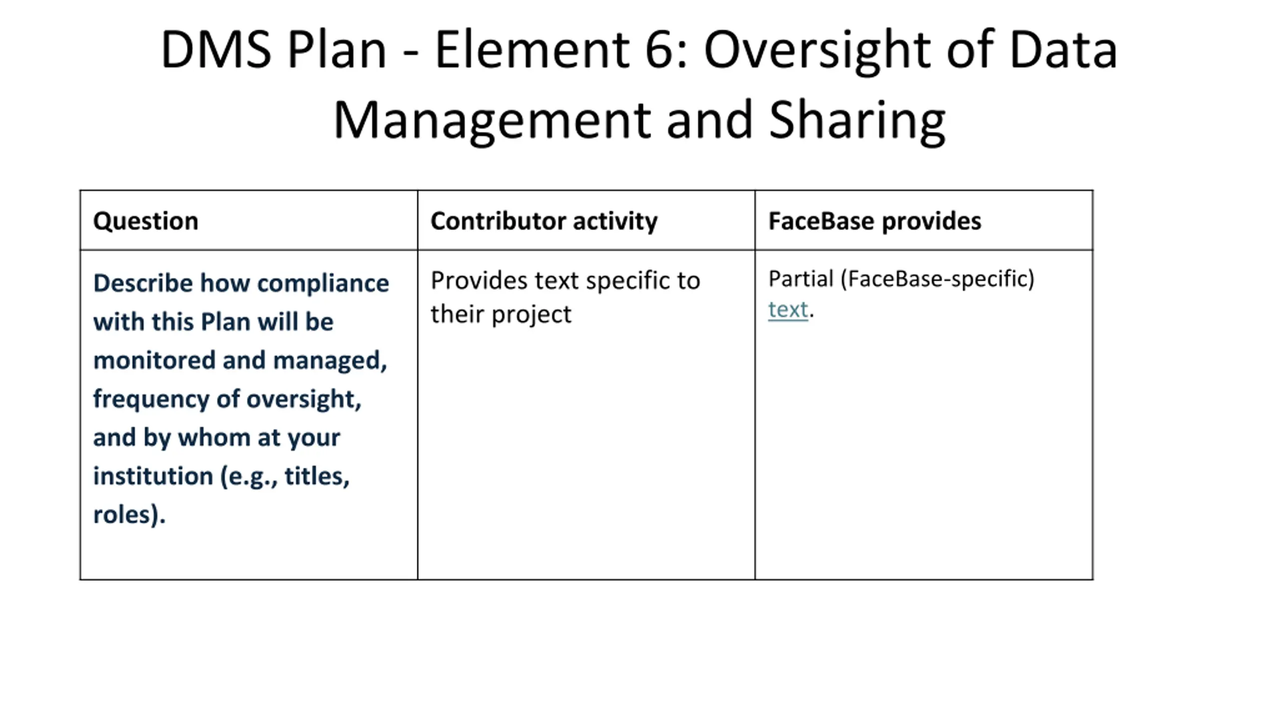 DMS Plan - Element 6: Oversight of Data Management and Sharing Question Contributor activity FaceBase provides Partial (FaceBase-specific) text. Provides text specific to their project Describe how compliance with this Plan will be monitored and managed, frequency of oversight, and by whom at your institution (e.g., titles, roles).