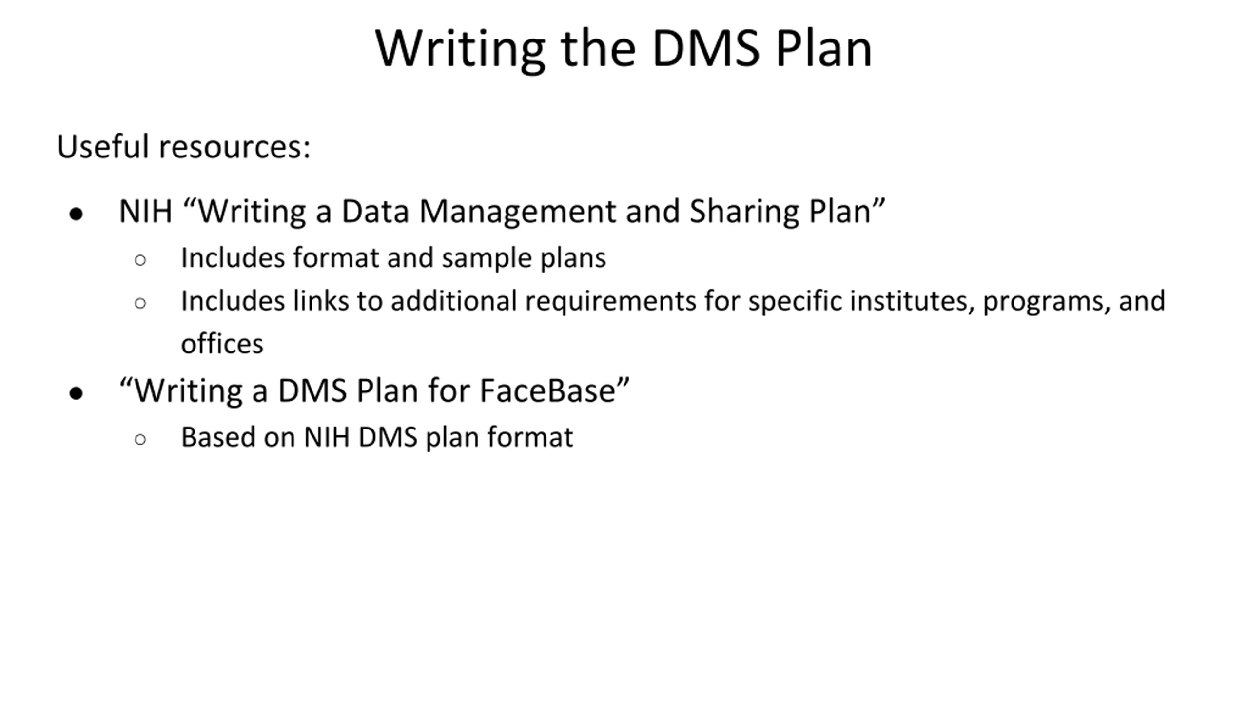 Writing the DMS Plan Useful resources: NIH Writing a Data Management and Sharing Plan Includes format and sample plans Includes links to additional requirements for specific institutes, programs, and offices Writing a DMS Plan for FaceBase Based on NIH DMS plan format