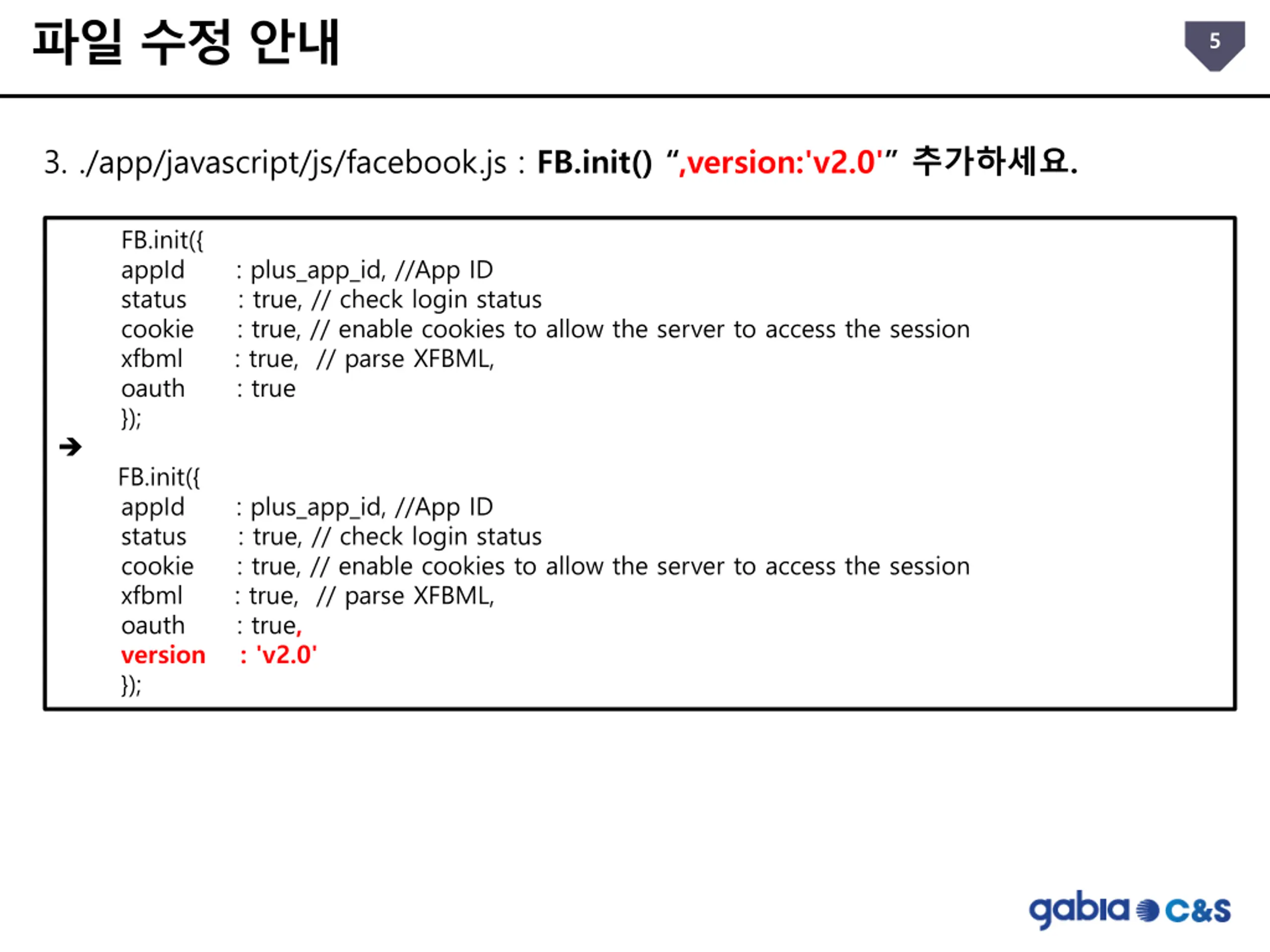 9 6. ./app/controllers/snsredirect.php 1) FB.init() FB.init({ appId: plus_app_id, oauth: true}); FB.init({ appId: plus_app_id, oauth: true, version : 'v{$this->__APP_VER__}'});//@2015-04-28 status: true, cookie: true, xfbml: true, status: true, cookie: true, xfbml: true, 2) JavaScript SDK : js.src = "//connect.facebook.net/en_US/all.js"; js.src = "//connect.facebook.net/en_US/sdk.js";