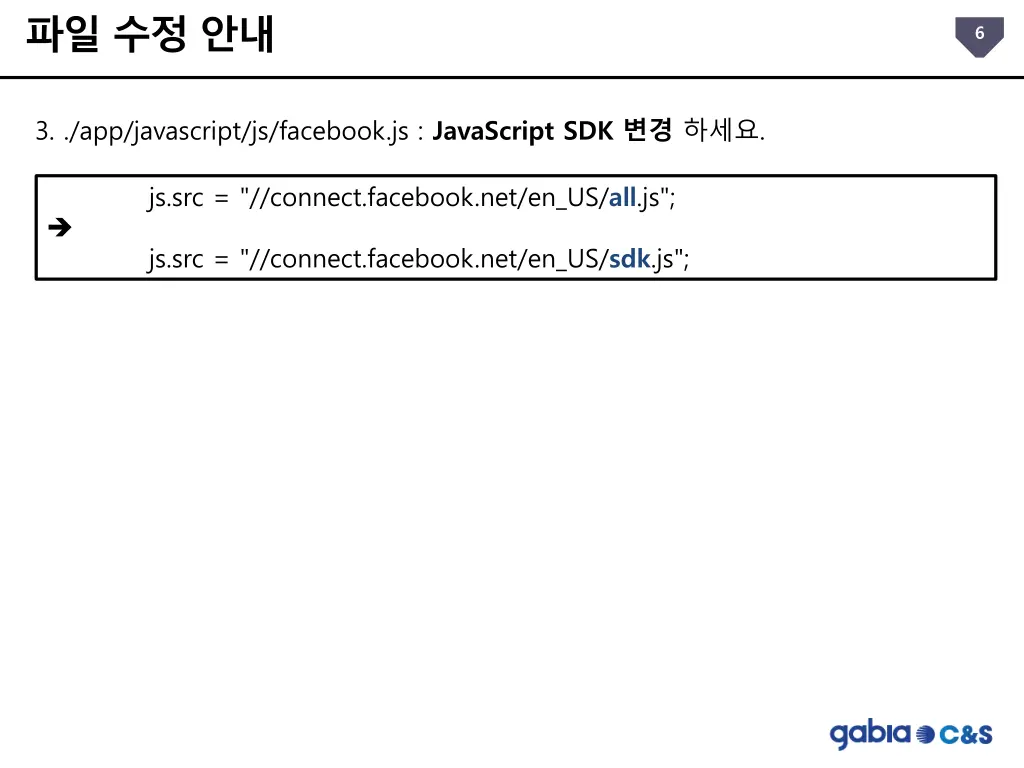6 3. ./app/javascript/js/facebook.js : JavaScript SDK . js.src = "//connect.facebook.net/en_US/all.js"; js.src = "//connect.facebook.net/en_US/sdk.js";