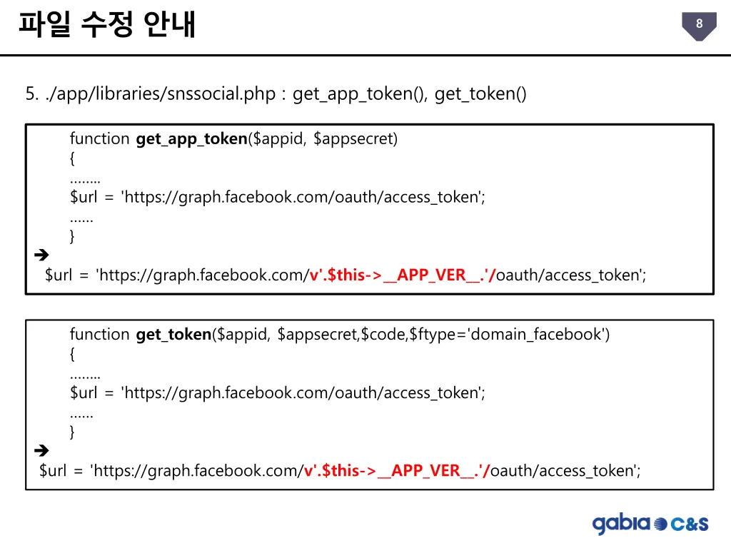 8 5. ./app/libraries/snssocial.php : get_app_token(), get_token() function get_app_token($appid, $appsecret) { .. $url = 'https://graph.facebook.com/oauth/access_token'; } $url = 'https://graph.facebook.com/v'.$this->__APP_VER__.'/oauth/access_token'; function get_token($appid, $appsecret,$code,$ftype='domain_facebook') { .. $url = 'https://graph.facebook.com/oauth/access_token'; } $url = 'https://graph.facebook.com/v'.$this->__APP_VER__.'/oauth/access_token';