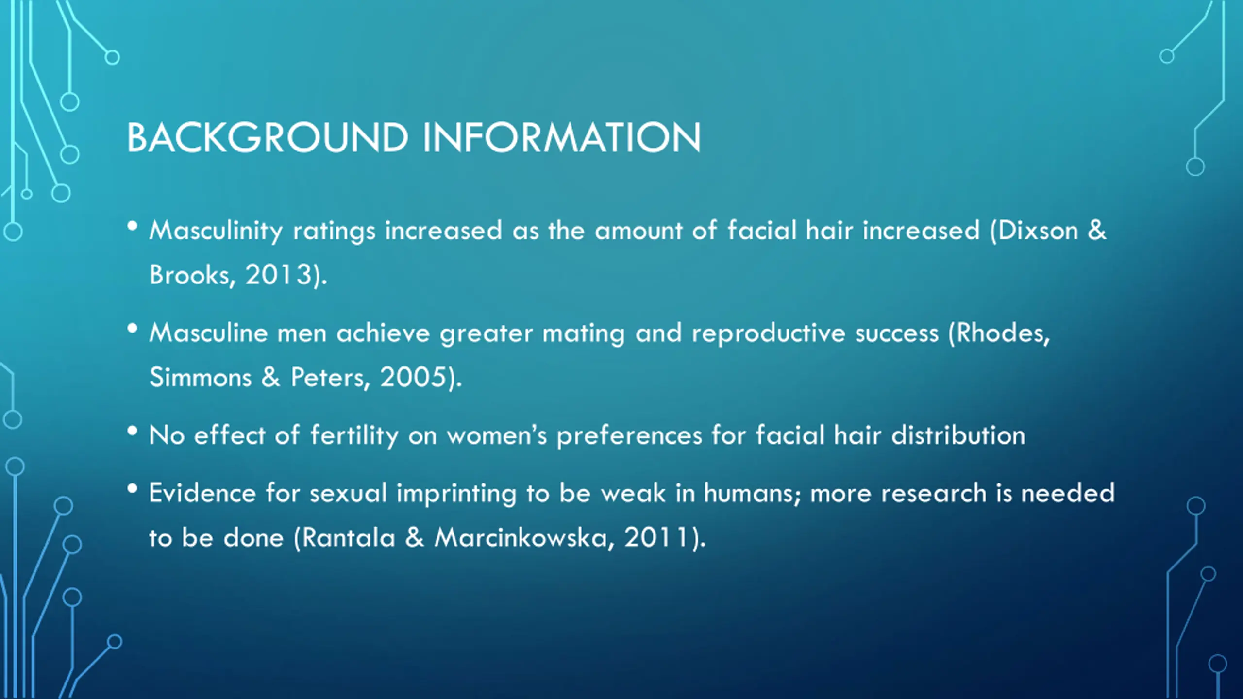 BACKGROUND INFORMATION Masculinity ratings increased as the amount of facial hair increased (Dixson & Brooks, 2013). Masculine men achieve greater mating and reproductive success (Rhodes, Simmons & Peters, 2005). No effect of fertility on women s preferences for facial hair distribution Evidence for sexual imprinting to be weak in humans; more research is needed to be done (Rantala & Marcinkowska, 2011).