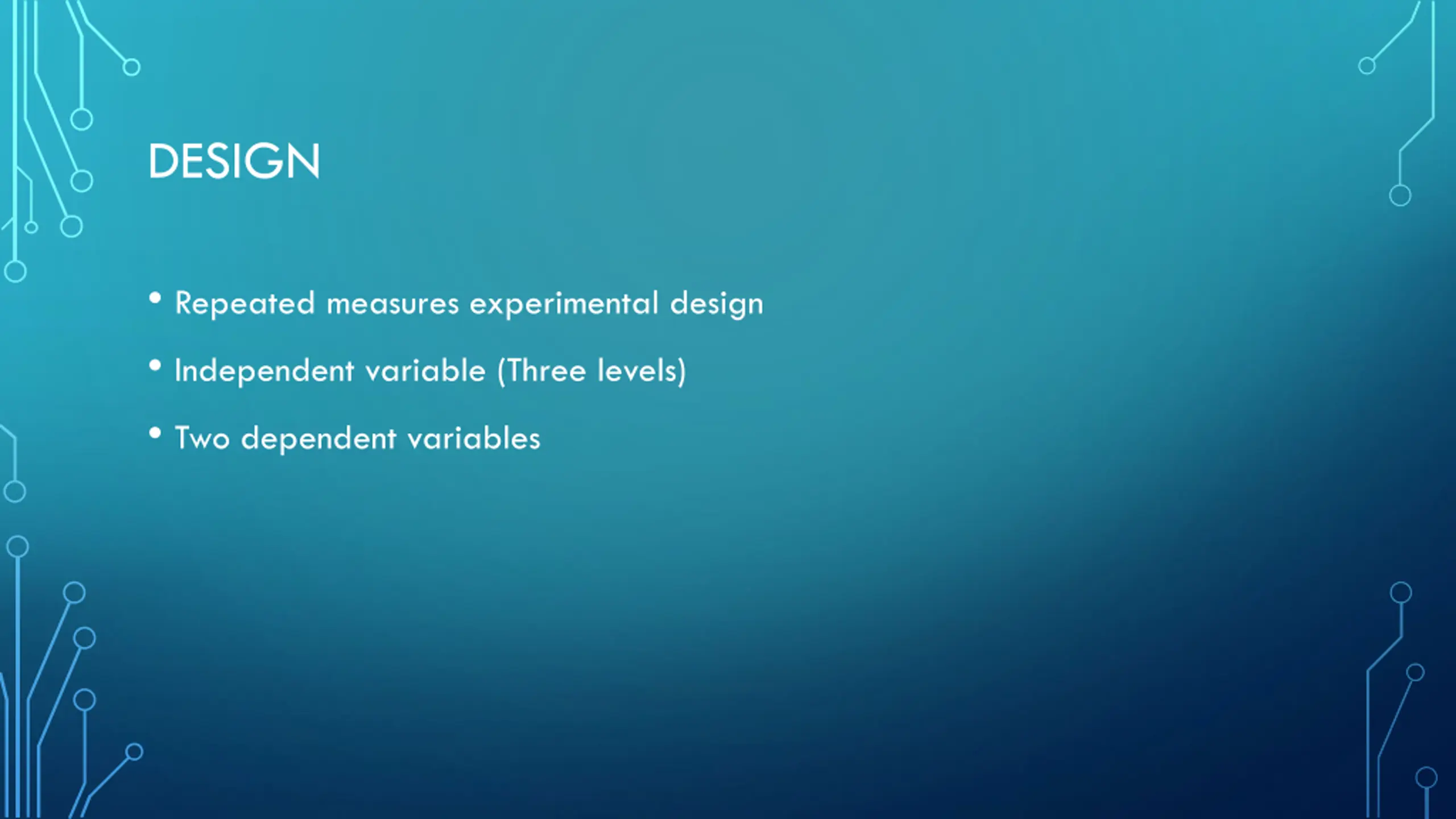 DESIGN Repeated measures experimental design Independent variable (Three levels) Two dependent variables