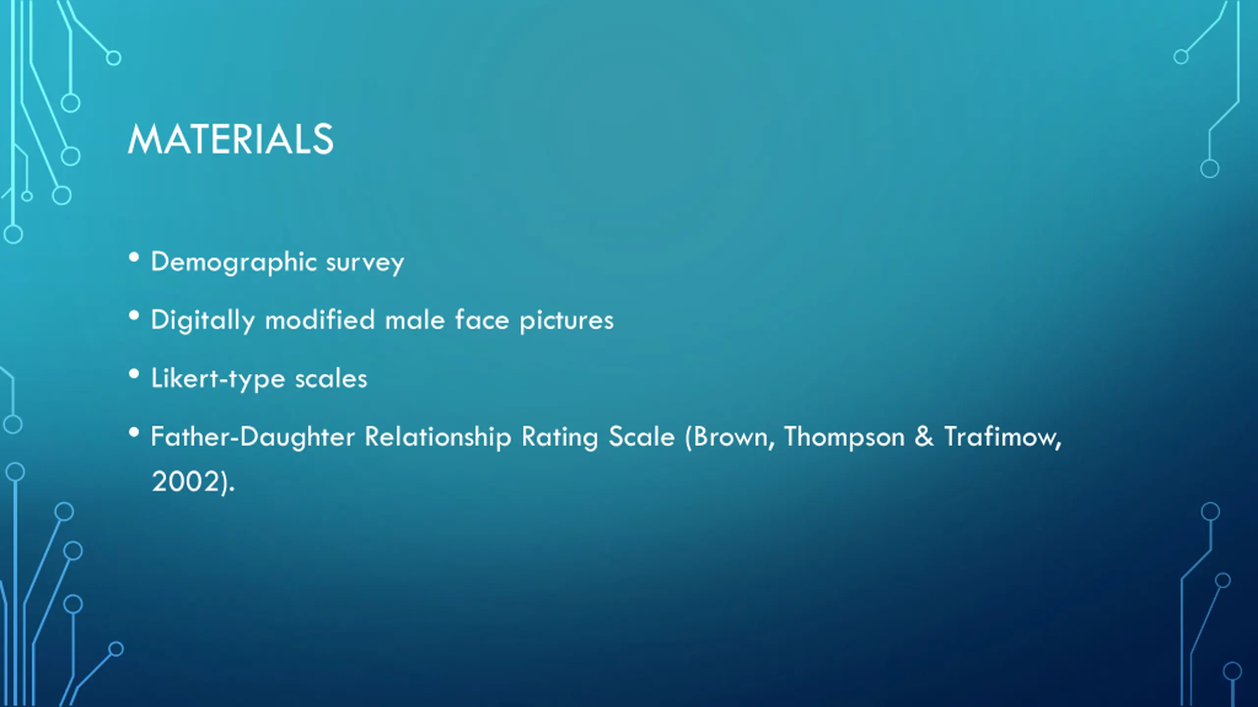 MATERIALS Demographic survey Digitally modified male face pictures Likert-type scales Father-Daughter Relationship Rating Scale (Brown, Thompson & Trafimow, 2002).