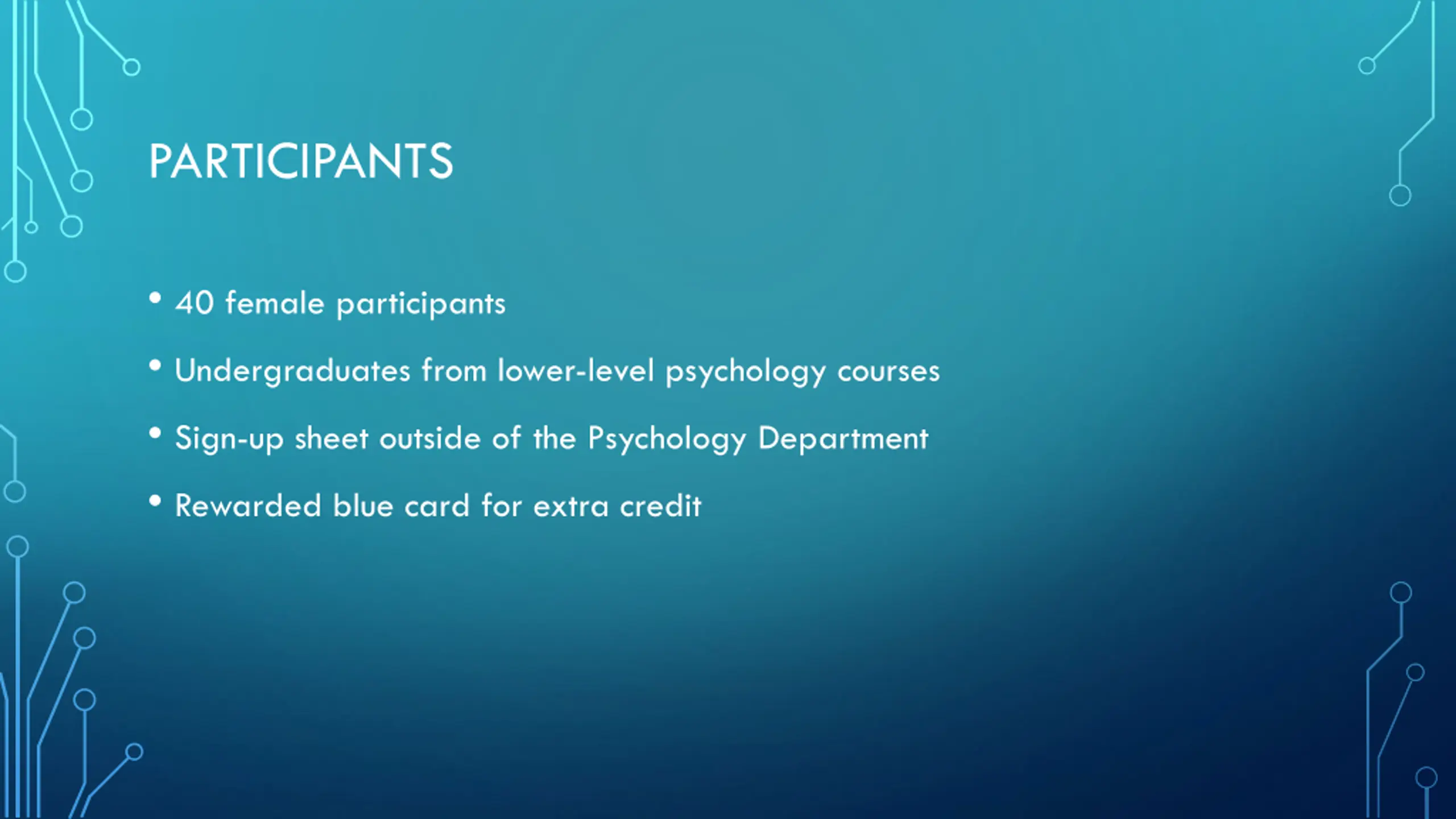 PARTICIPANTS 40 female participants Undergraduates from lower-level psychology courses Sign-up sheet outside of the Psychology Department Rewarded blue card for extra credit