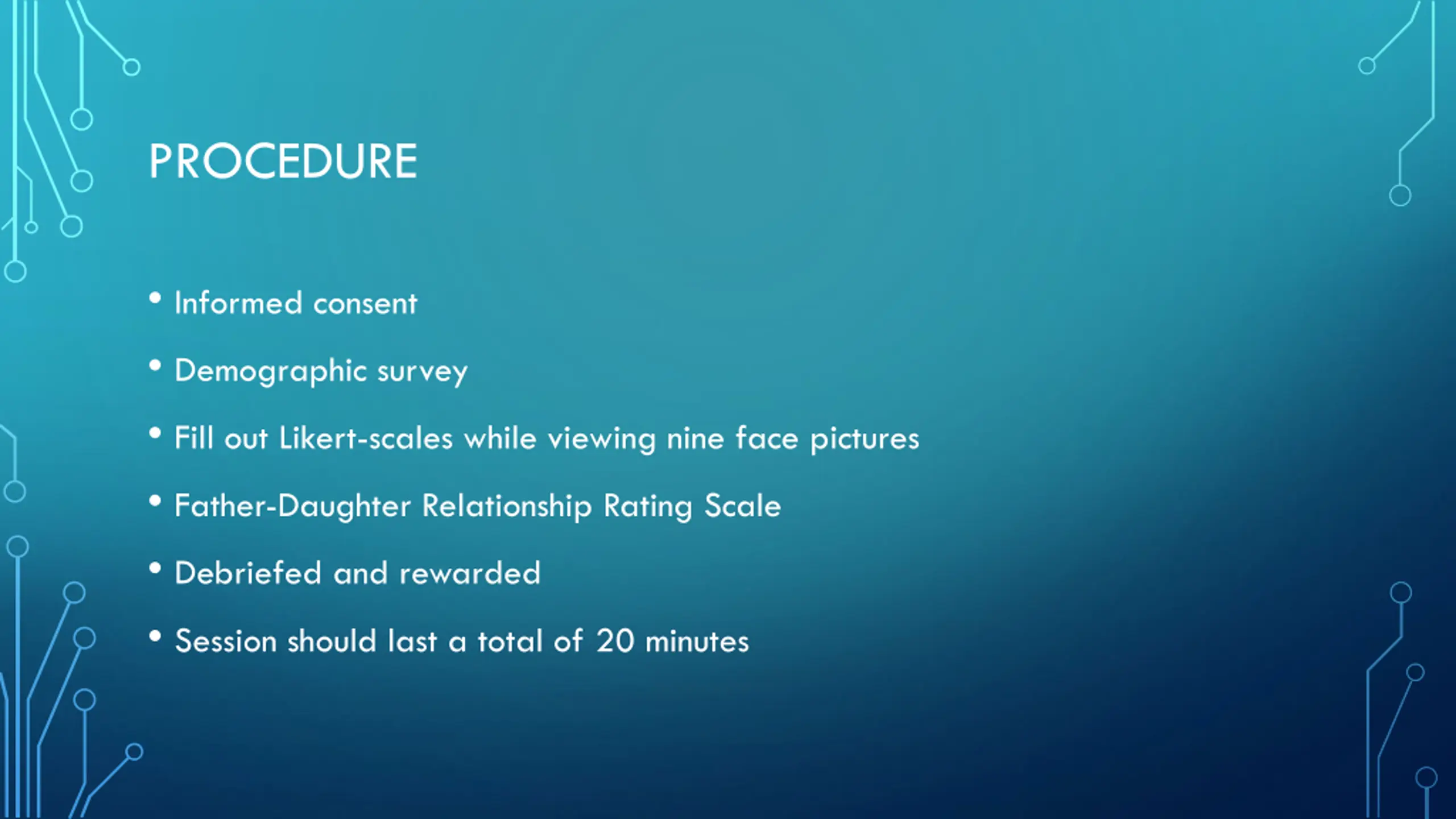PROCEDURE Informed consent Demographic survey Fill out Likert-scales while viewing nine face pictures Father-Daughter Relationship Rating Scale Debriefed and rewarded Session should last a total of 20 minutes
