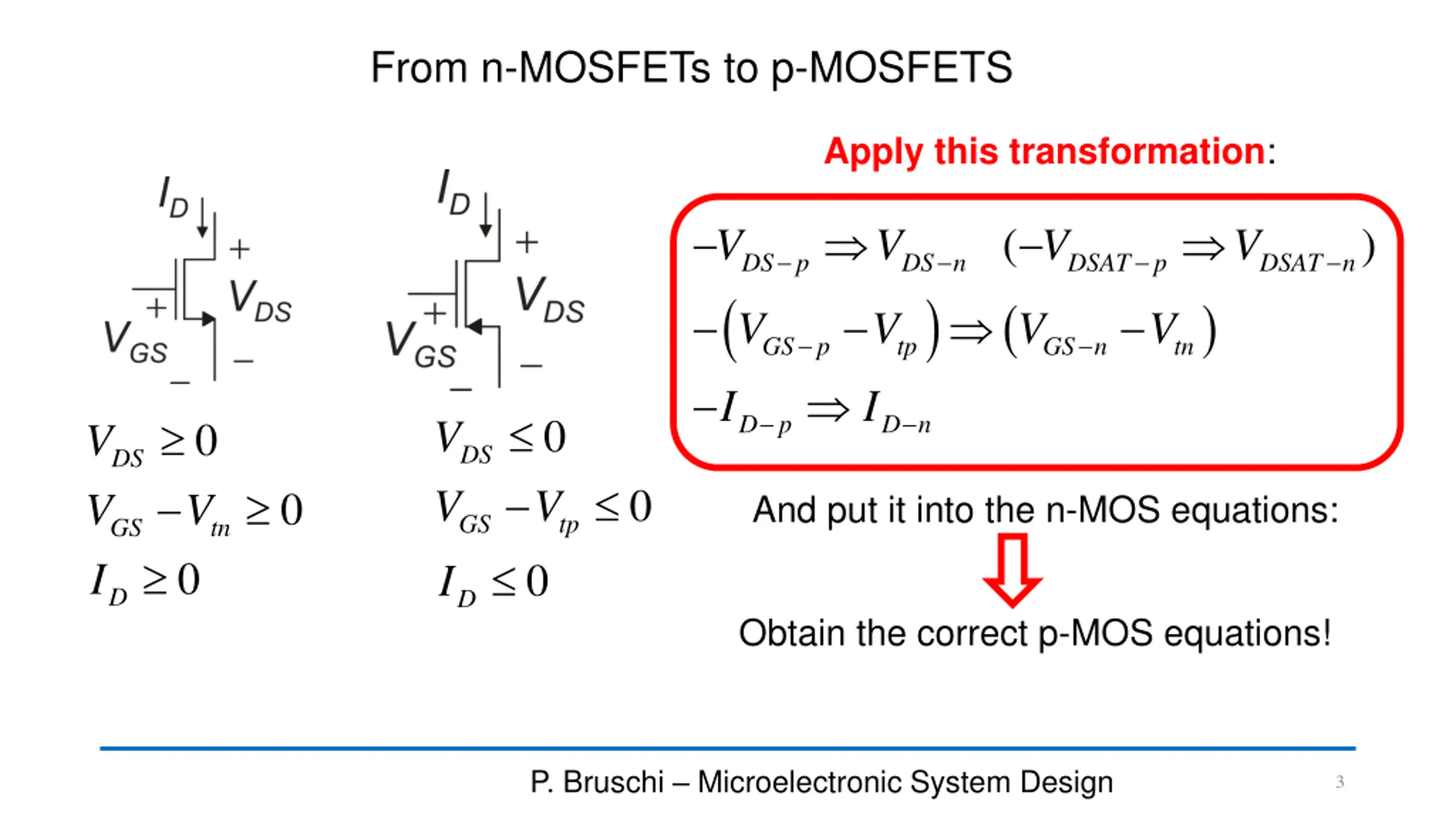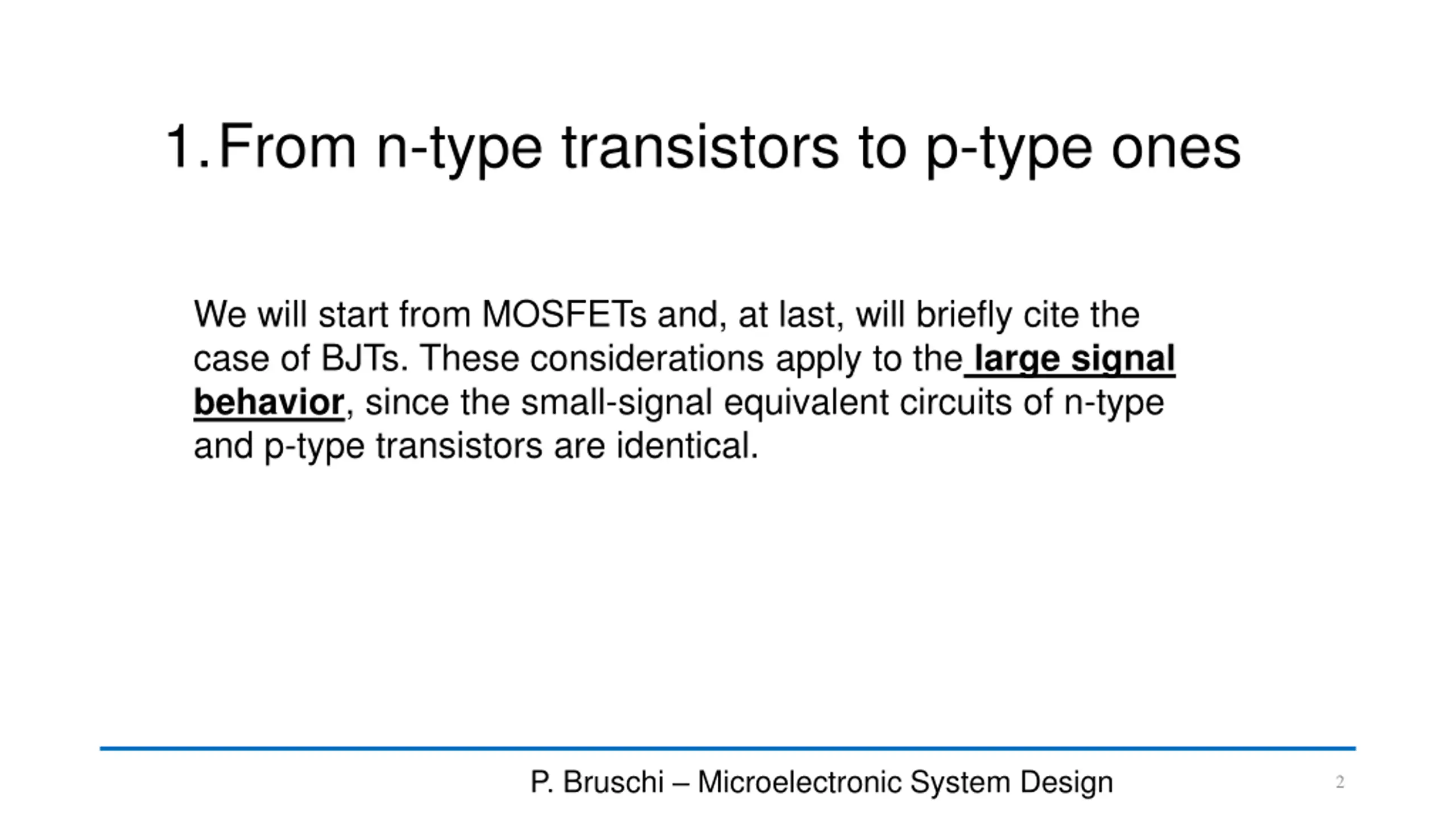 1.From n-type transistors to p-type ones We will start from MOSFETs and, at last, will briefly cite the case of BJTs. These considerations apply to the large signal behavior, since the small-signal equivalent circuits of n-type and p-type transistors are identical. P. Bruschi Microelectronic System Design 2