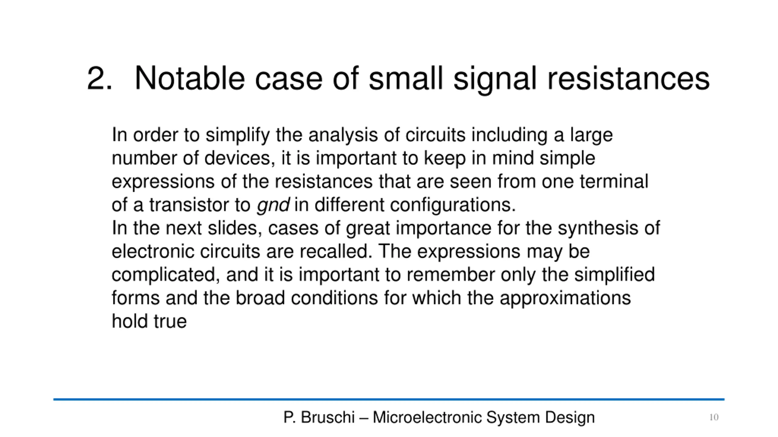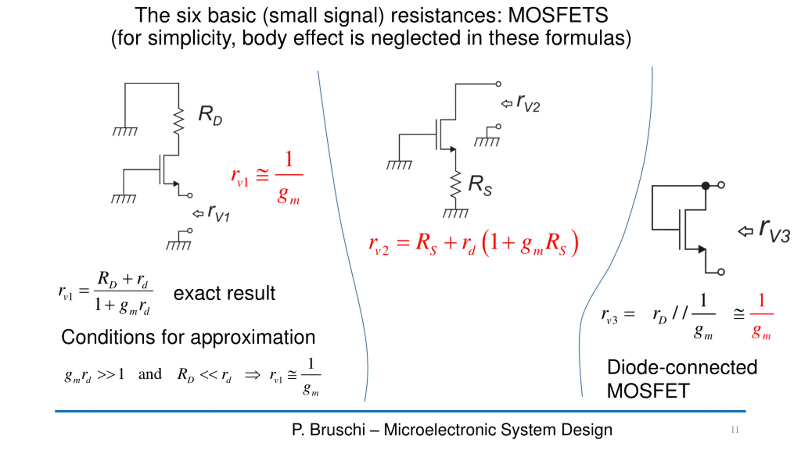 2. Notable case of small signal resistances In order to simplify the analysis of circuits including a large number of devices, it is important to keep in mind simple expressions of the resistances that are seen from one terminal of a transistor to gnd in different configurations. In the next slides, cases of great importance for the synthesis of electronic circuits are recalled. The expressions may be complicated, and it is important to remember only the simplified forms and the broad conditions for which the approximations hold true P. Bruschi Microelectronic System Design 10