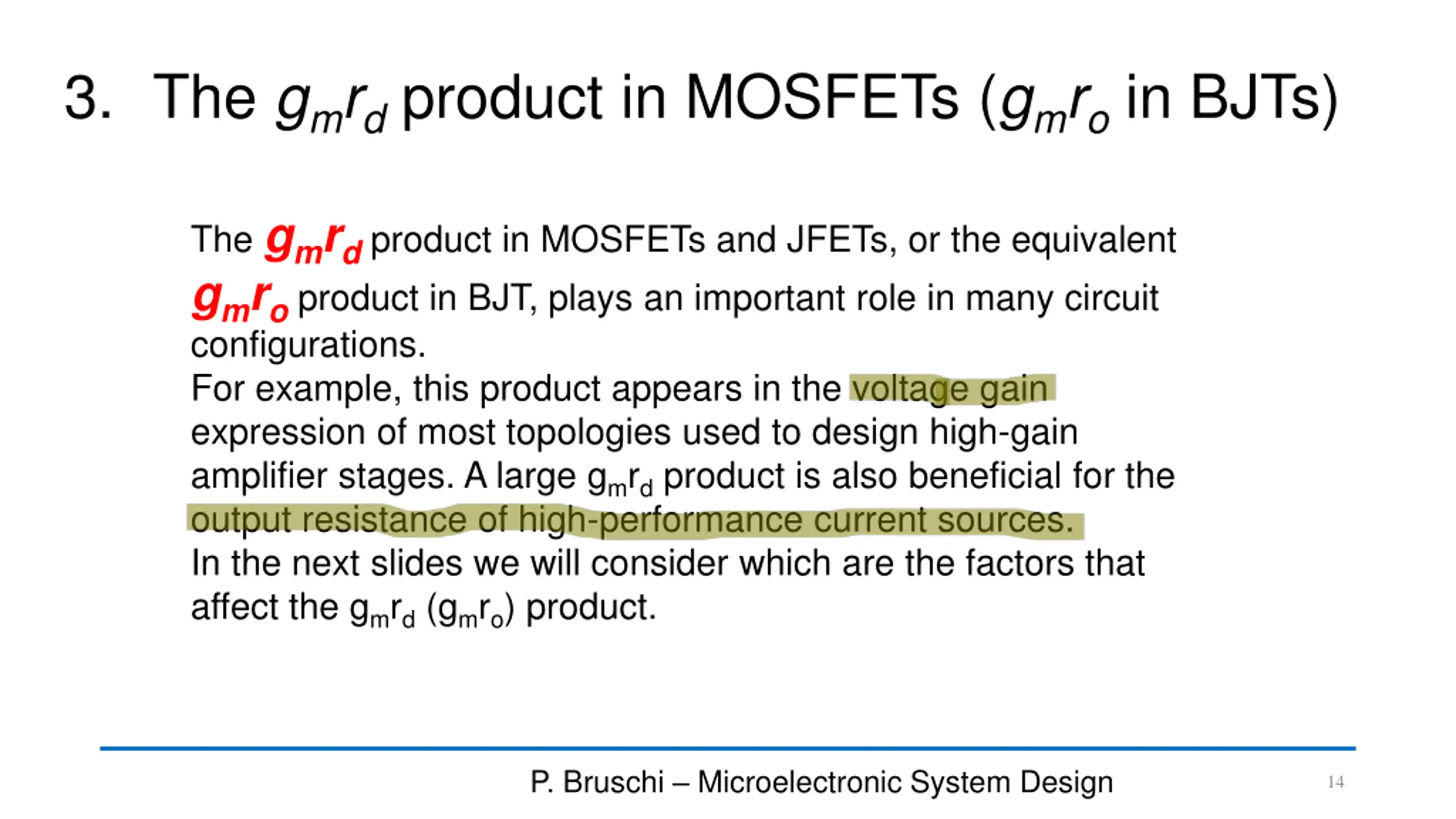 3. The gmrdproduct in MOSFETs (gmroin BJTs) The gmrdproduct in MOSFETs and JFETs, or the equivalent gmroproduct in BJT, plays an important role in many circuit configurations. For example, this product appears in the voltage gain expression of most topologies used to design high-gain amplifier stages. A large gmrdproduct is also beneficial for the output resistance of high-performance current sources. In the next slides we will consider which are the factors that affect the gmrd(gmro) product. P. Bruschi Microelectronic System Design 14