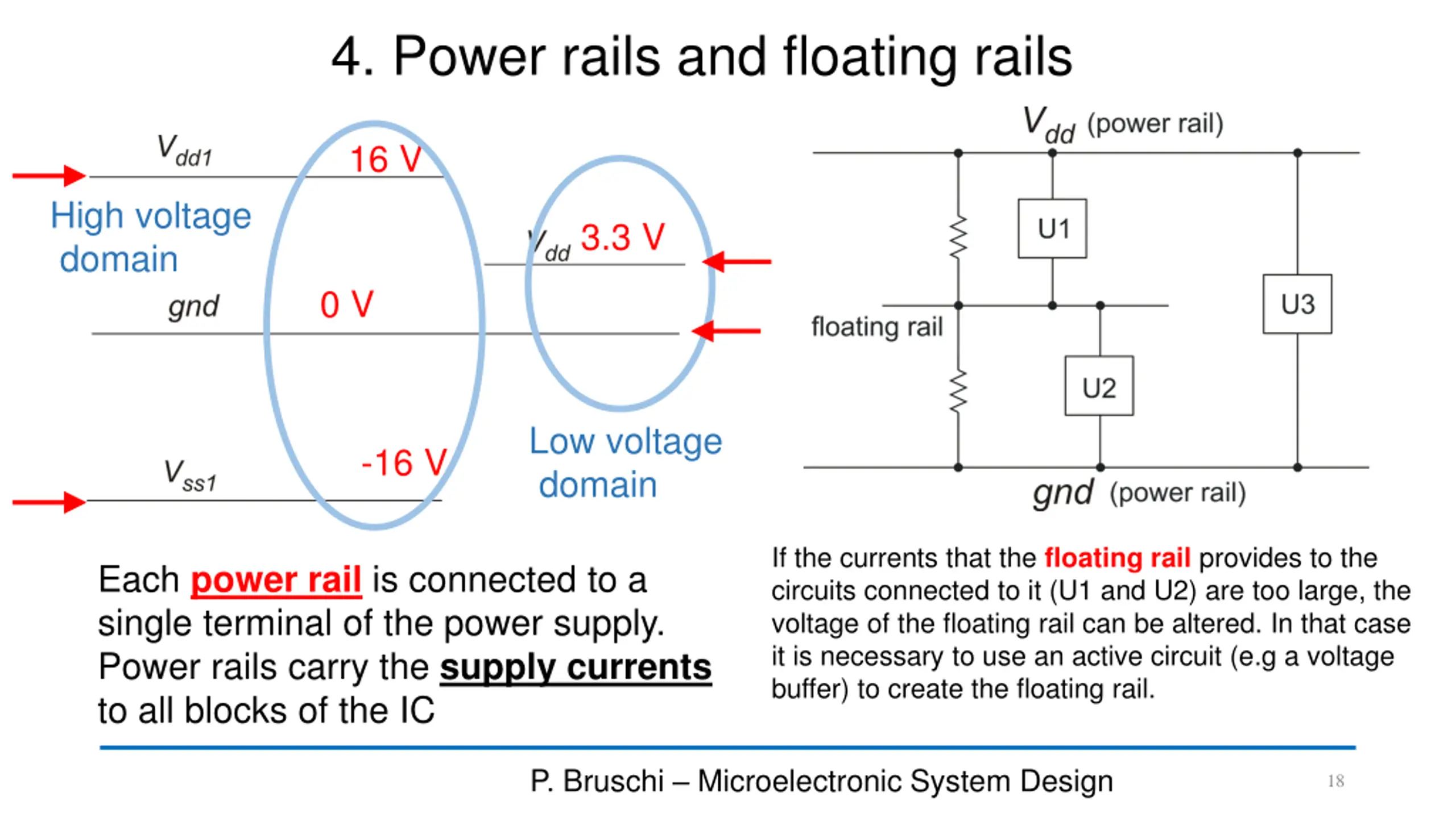 4. Power rails and floating rails 16 V High voltage domain 3.3 V 0 V Low voltage domain -16 V If the currents that the floating rail provides to the circuits connected to it (U1 and U2) are too large, the voltage of the floating rail can be altered. In that case it is necessary to use an active circuit (e.g a voltage buffer) to create the floating rail. Each power rail is connected to a single terminal of the power supply. Power rails carry the supply currents to all blocks of the IC P. Bruschi Microelectronic System Design 18