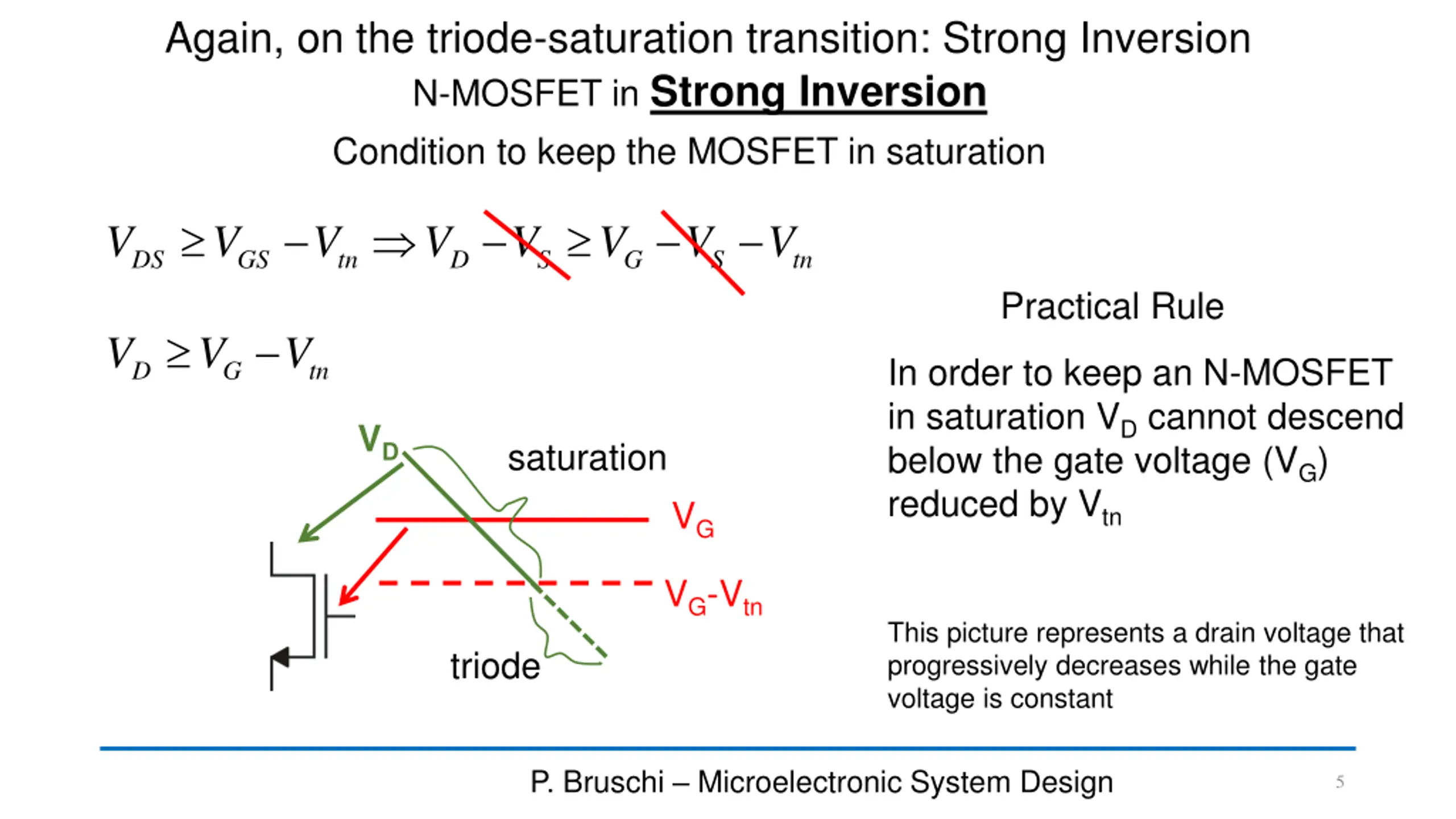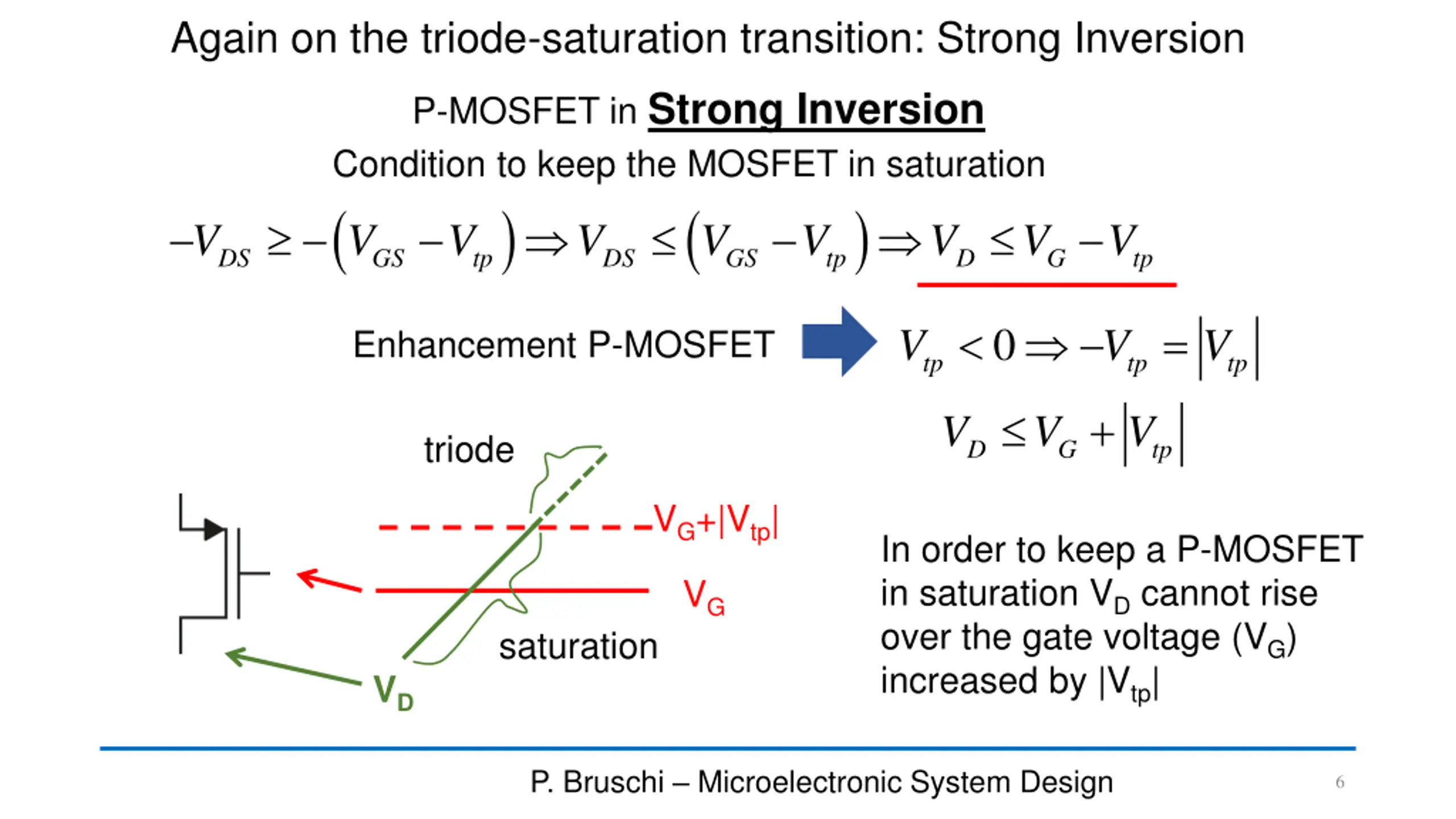 Again, on the triode-saturation transition: Strong Inversion N-MOSFET in Strong Inversion Condition to keep the MOSFET in saturation V V V V V V V V DS GS tn D S G S tn Practical Rule V V V In order to keep an N-MOSFET in saturation VDcannot descend below the gate voltage (VG) reduced by Vtn D G tn VD saturation VG VG-Vtn This picture represents a drain voltage that progressively decreases while the gate voltage is constant triode P. Bruschi Microelectronic System Design 5