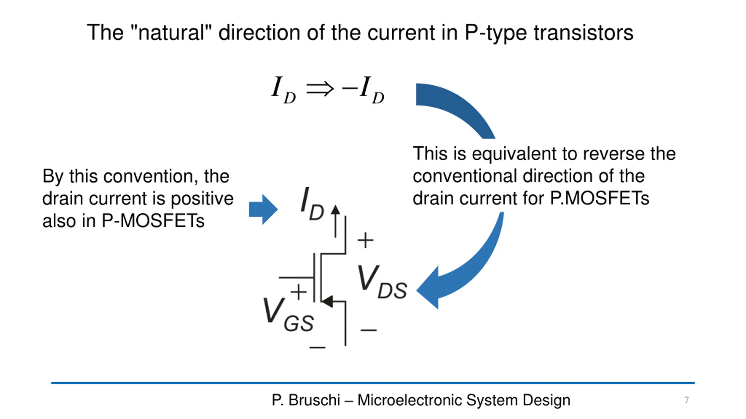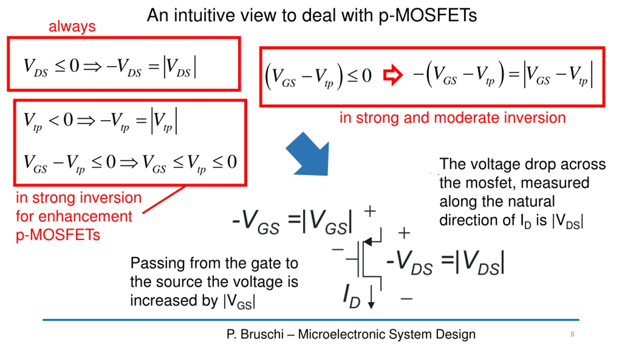 The "natural" direction of the current in P-type transistors I I D D This is equivalent to reverse the conventional direction of the drain current for P.MOSFETs By this convention, the drain current is positive also in P-MOSFETs P. Bruschi Microelectronic System Design 7