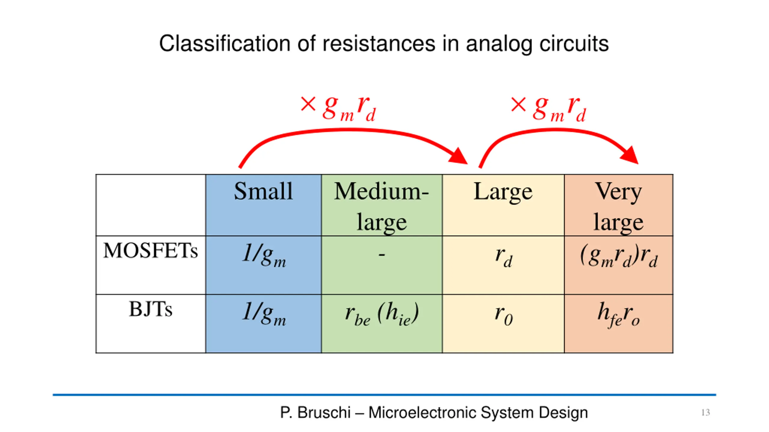 Classification of resistances in analog circuits g r g r m d m d Small Medium- large - Large Very large (gmrd)rd MOSFETs 1/gm rd BJTs 1/gm rbe(hie) r0 hfero P. Bruschi Microelectronic System Design 13