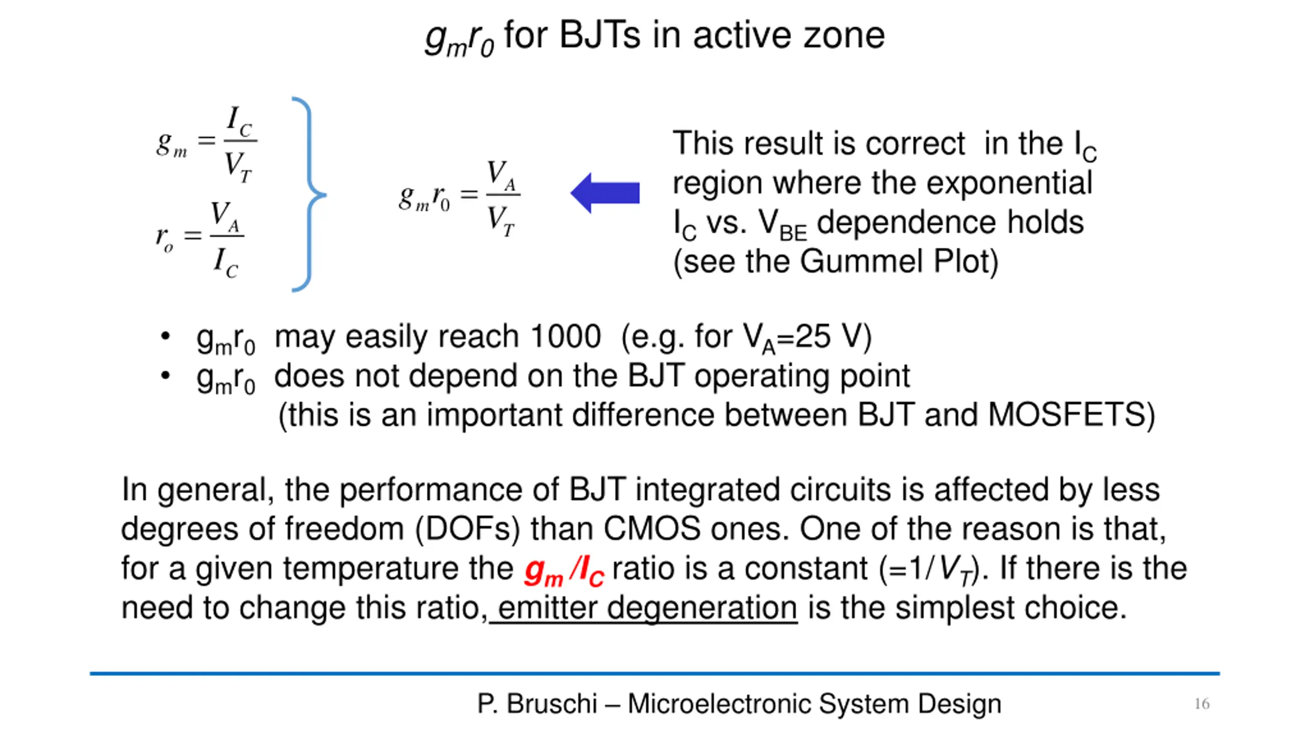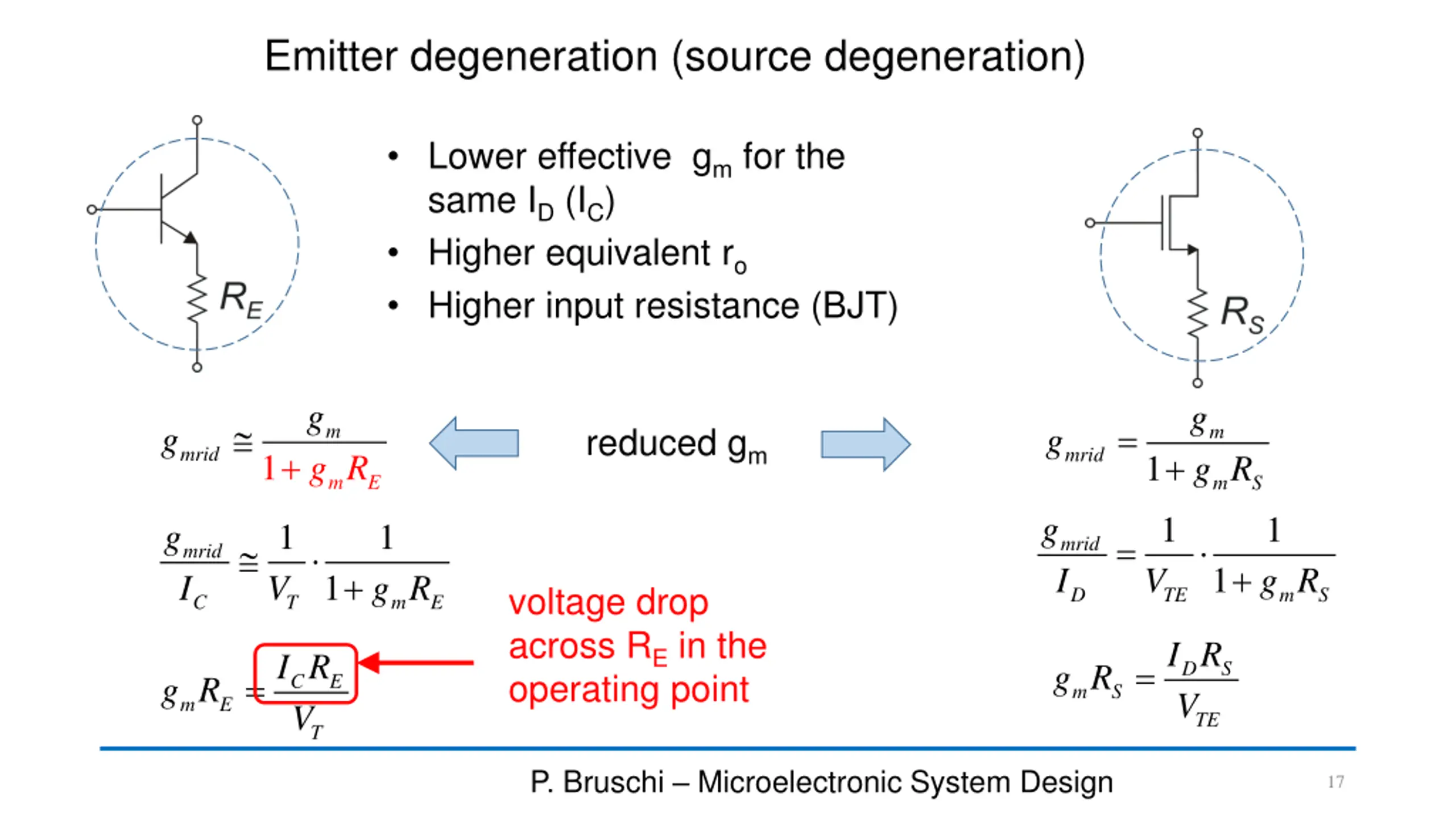 gmr0for BJTs in active zone I V = C g This result is correct in the IC region where the exponential ICvs. VBEdependence holds (see the Gummel Plot) m V V T = g r A 0 m V I = r A T o C gmr0may easily reach 1000 (e.g. for VA=25 V) gmr0does not depend on the BJT operating point (this is an important difference between BJT and MOSFETS) In general, the performance of BJT integrated circuits is affected by less degrees of freedom (DOFs) than CMOS ones. One of the reason is that, for a given temperature the gm /ICratio is a constant (=1/VT). If there is the need to change this ratio, emitter degeneration is the simplest choice. P. Bruschi Microelectronic System Design 16