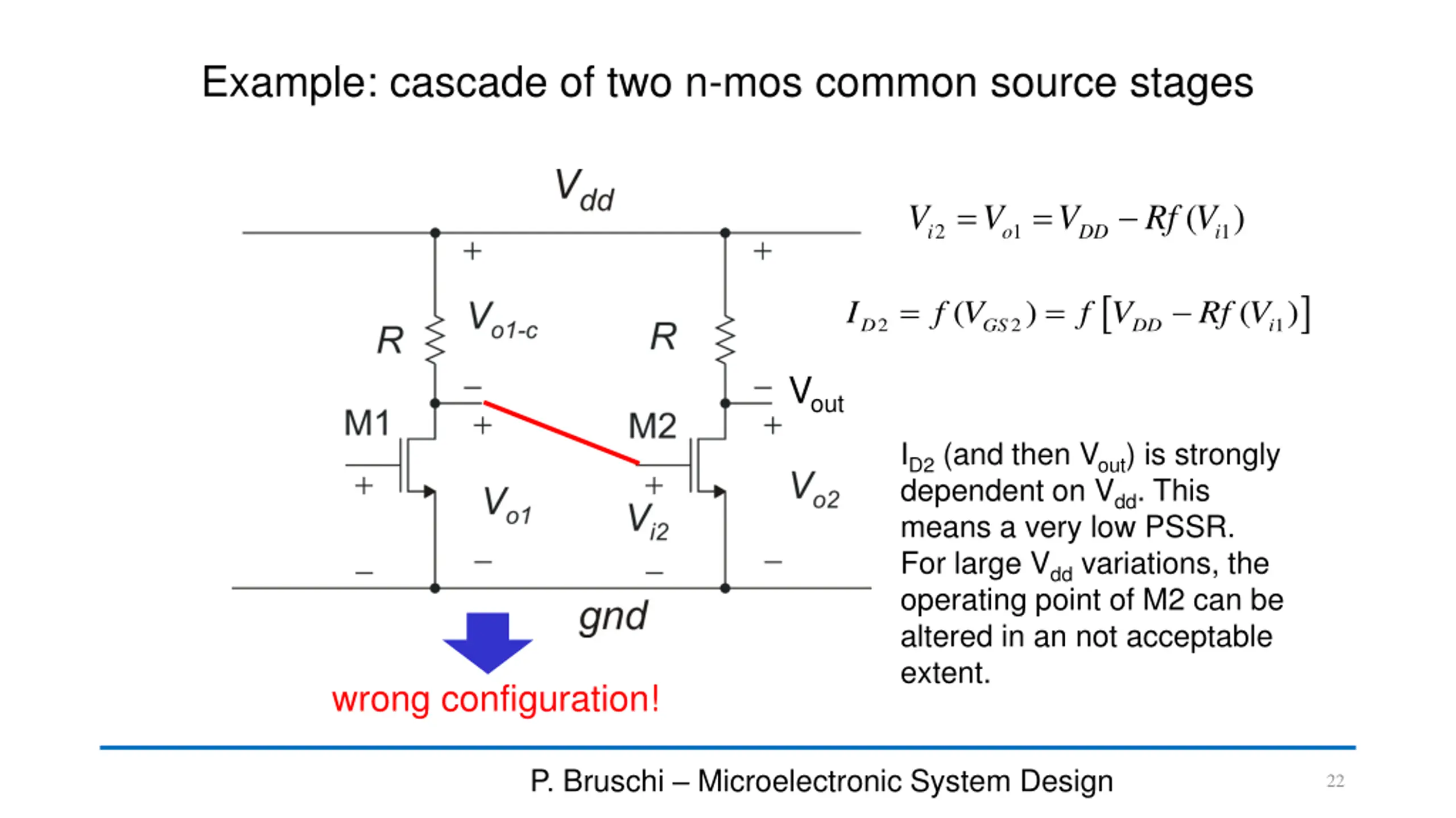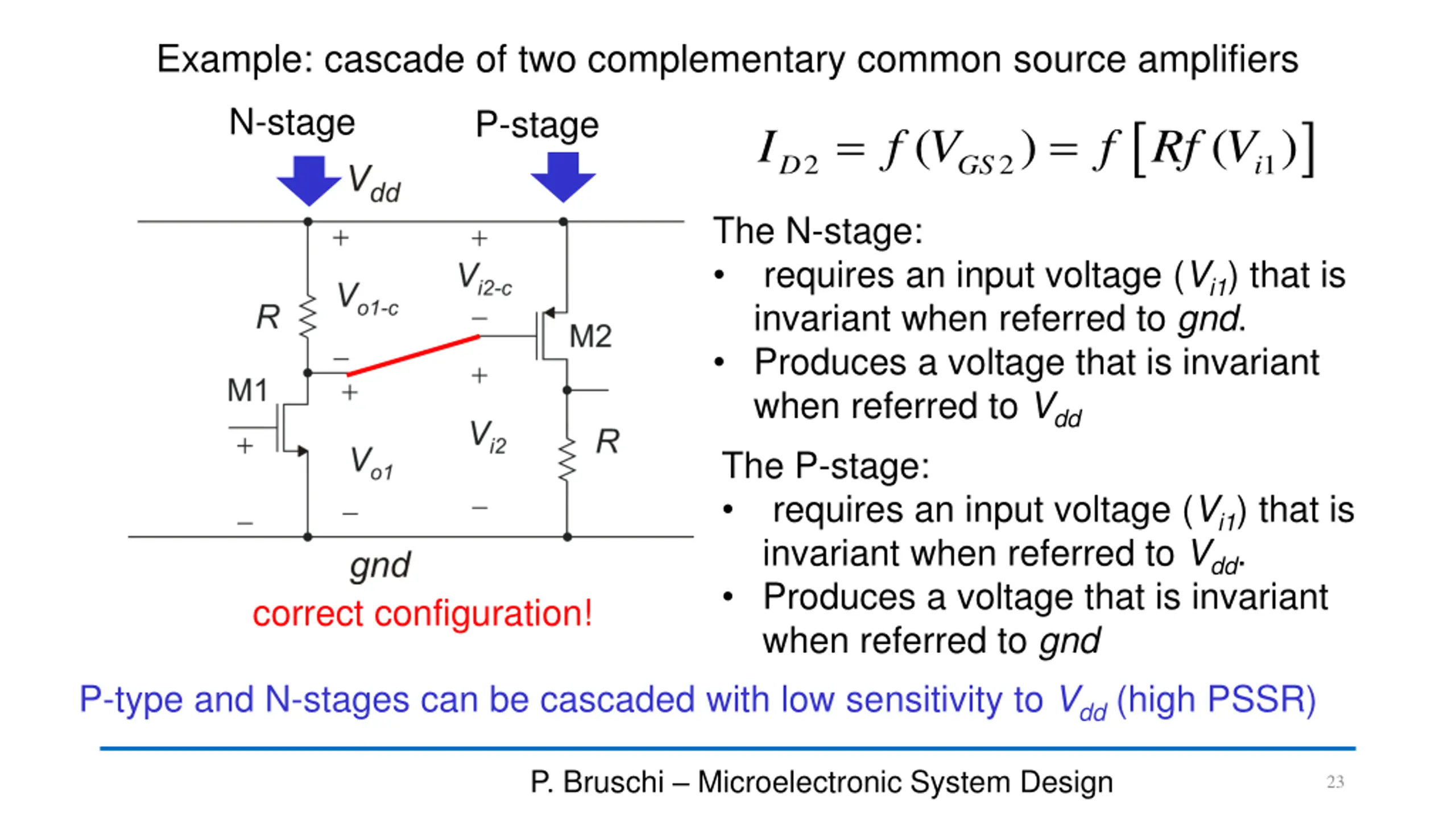 Example: cascade of two n-mos common source stages = = ( ) V V V Rf V 2 1 1 i o DD i = = ( ) ( ) I f V f V Rf V 2 2 1 D GS DD i Vout ID2(and then Vout) is strongly dependent on Vdd. This means a very low PSSR. For large Vddvariations, the operating point of M2 can be altered in an not acceptable extent. wrong configuration! P. Bruschi Microelectronic System Design 22