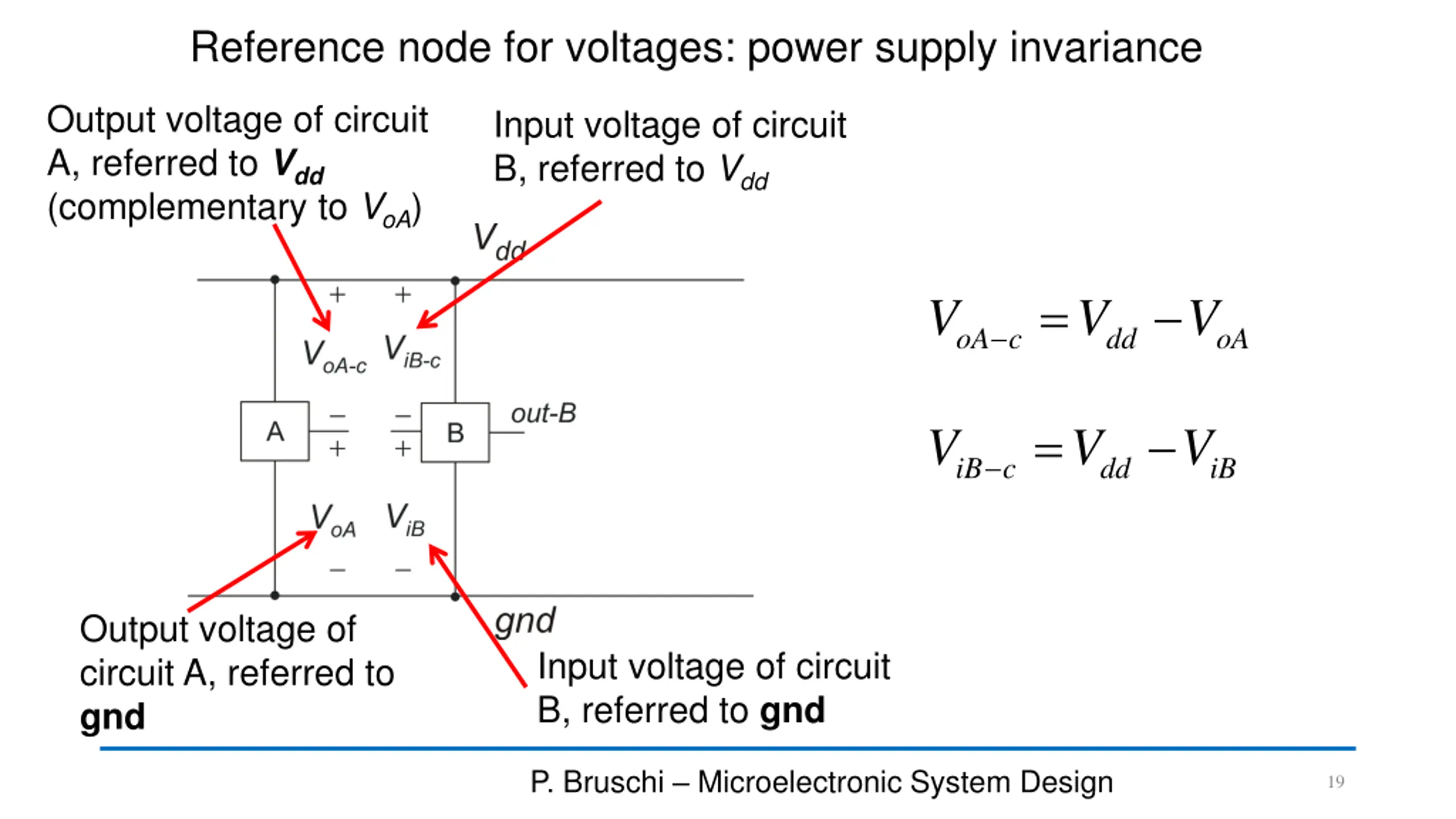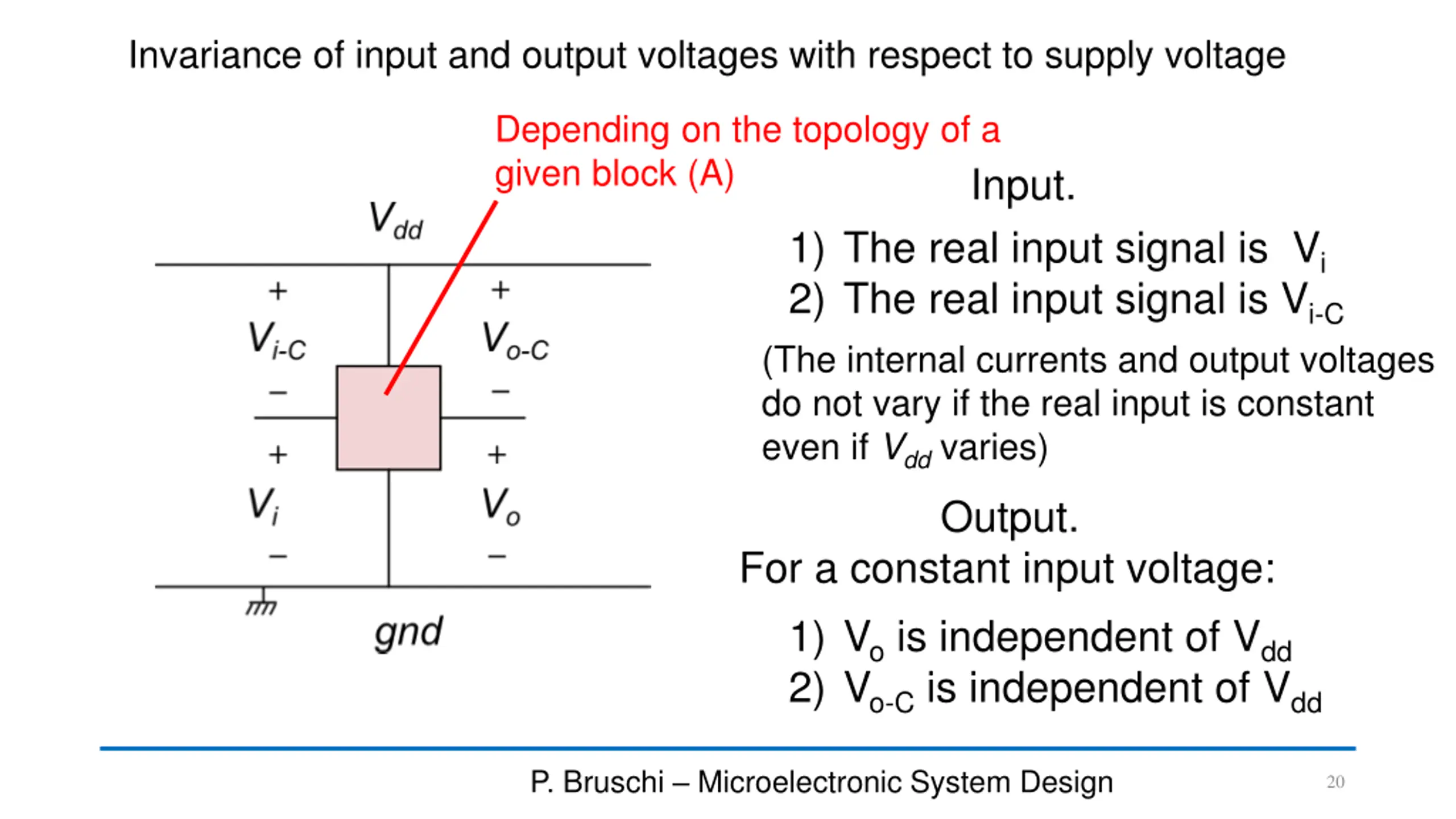 Reference node for voltages: power supply invariance Output voltage of circuit A, referred to Vdd (complementary to VoA) Input voltage of circuit B, referred to Vdd = oA c V V V dd oA = iB c V V V dd iB Output voltage of circuit A, referred to gnd Input voltage of circuit B, referred to gnd P. Bruschi Microelectronic System Design 19