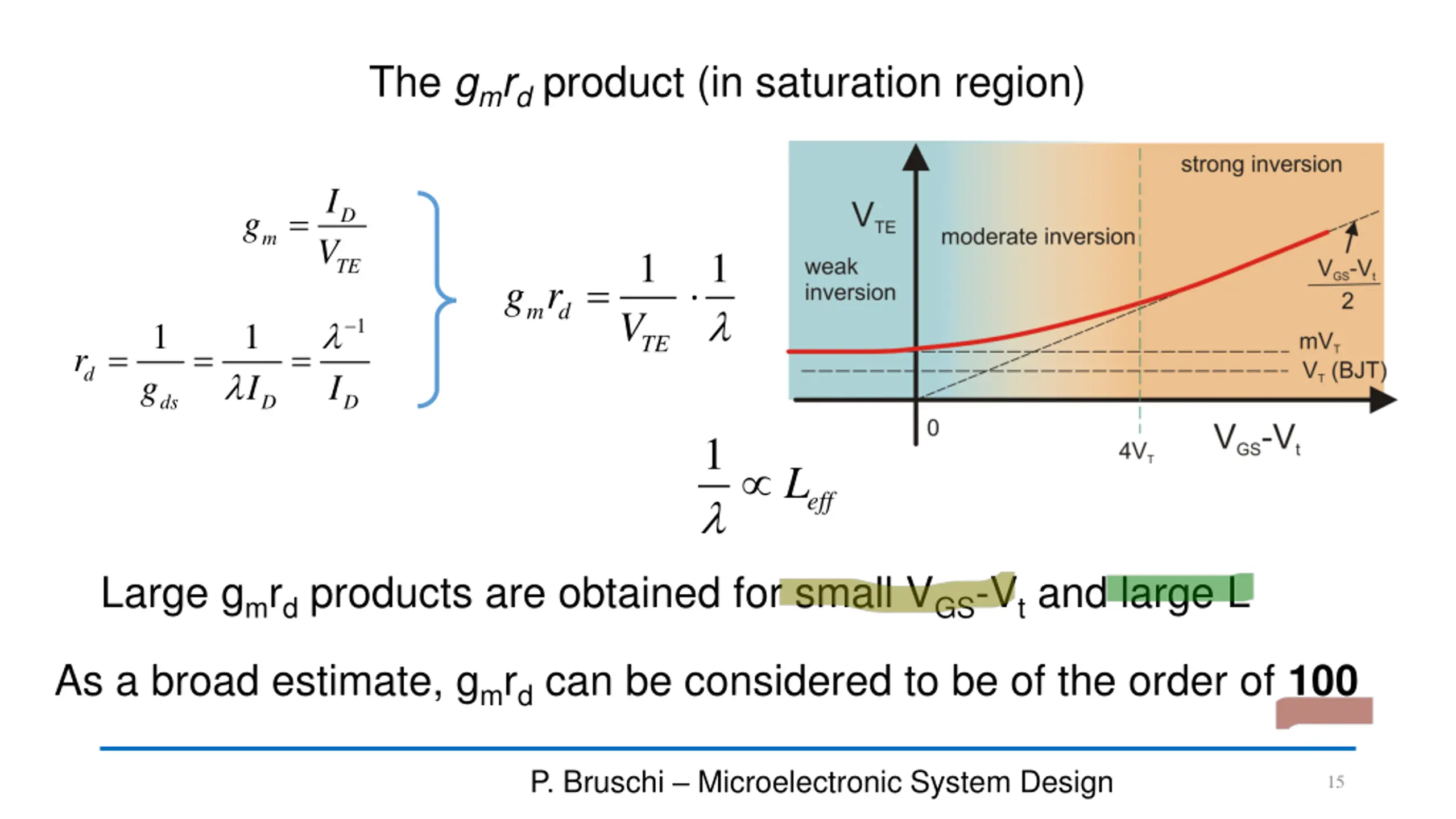 The gmrdproduct (in saturation region) I = g D m V 1 1 TE = g r m d V 1 1 1 I TE = = = r d g I ds D D 1 L eff Large gmrdproducts are obtained for small VGS-Vtand large L As a broad estimate, gmrdcan be considered to be of the order of 100 P. Bruschi Microelectronic System Design 15