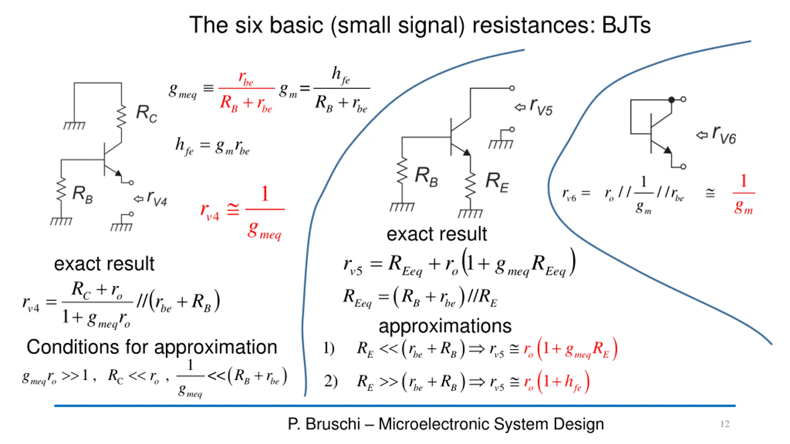 The six basic (small signal) resistances: BJTs h r fe = b + e g g meq m + R r R r B b e B b e = h m be g r fe 1 1 g 1 = / / / / r r r g 6 v o be v r m m 4 g exact result meq ( 1 )// ) = + + + r R ( r g R exact result 5 v Eeq R o meq Eeq + R + r ( ) = approximations R r R = + // C o r r r R Eeq B be E 4 v be B 1 g meq o ( ( ) ( ( ) ) Conditions for approximation + + 1) 1 R r R r r g R 5 E be B v o meq E 1 ( ) ) + 1 , , << g r R r R r + + 2) 1 R r R r r h C meq o o B be g 5 E be B v o fe meq P. Bruschi Microelectronic System Design 12