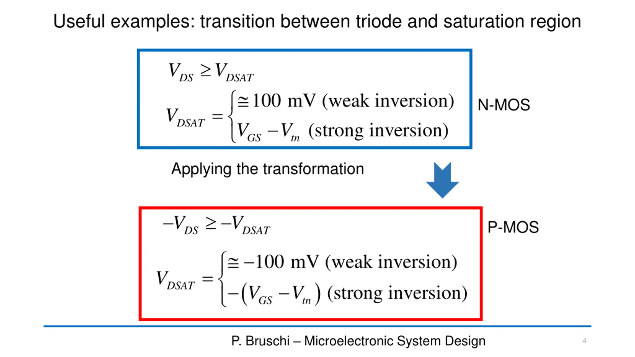 From n-MOSFETs to p-MOSFETS Apply this transformation: DS p V DSAT V ( ) DS n V DSAT n V p ( I ) ( ) GS p V V GS n V V tp tn I D p D n 0 V V V 0 V V V I DS DS 0 0 And put it into the n-MOS equations: GS tp GS tn 0 0 I D D Obtain the correct p-MOS equations! P. Bruschi Microelectronic System Design 3
